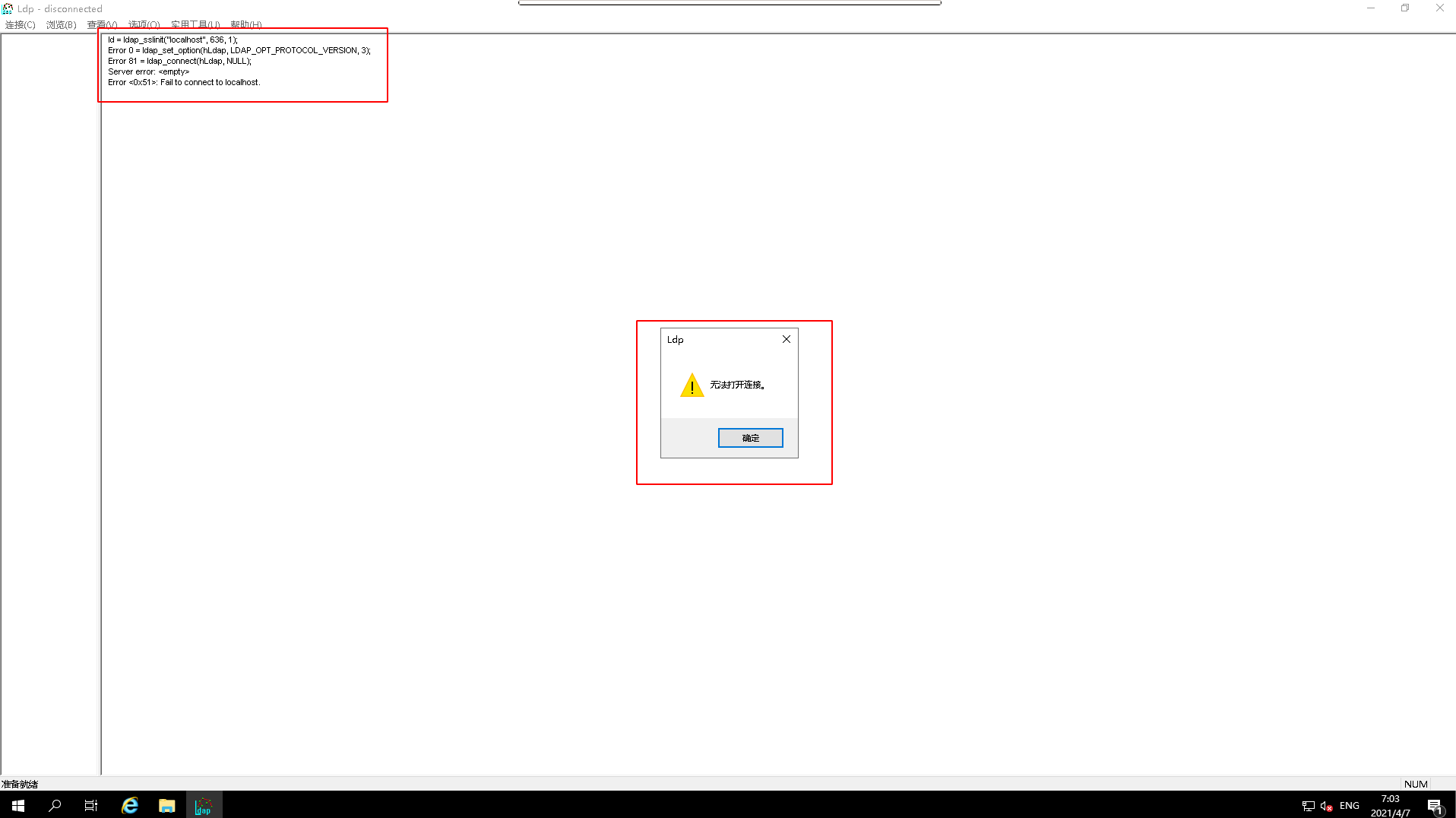 ldaps协议的开启, 需要安装并配置Active Directory 证书服务, 而现在并没有进行相关安装及配置,连接结果应该是失败的。