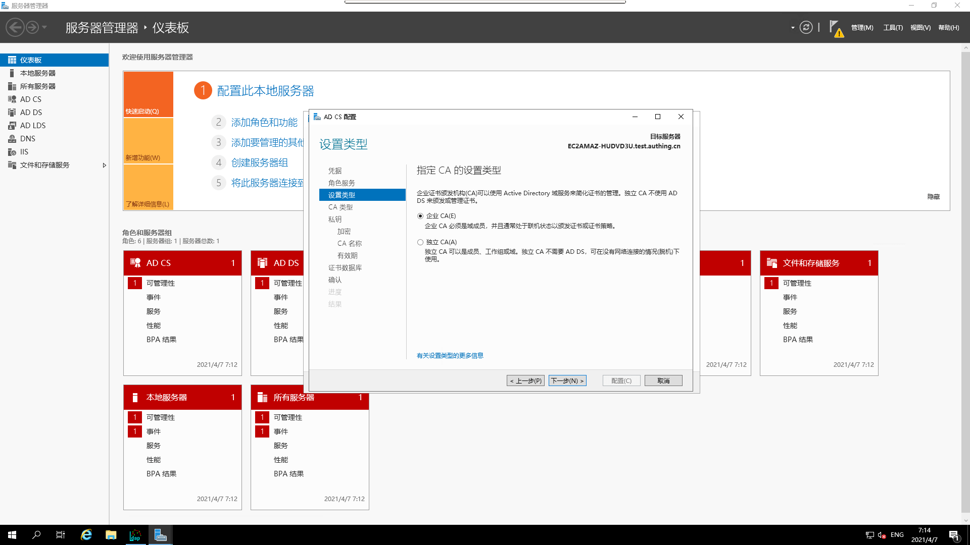 配置 AD CS 是为了完成 AD CS 的初始化工作, 以完成后续功能的构建。