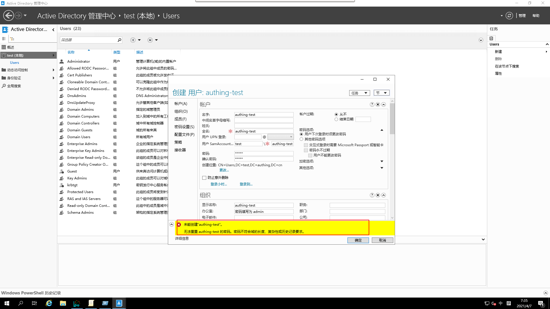 - Authing 中的当前密码强度等级较低, 用户新增加了一个弱密码账户, 而 AD 中的密码当前设置状态要求一定的复杂度, 当用户同步过去的时候, 就会因为这些问题造成同步状态异常(用户虽然可以同步, 但是状态一直是禁用状态,因为密码会设置不成功,不符合 AD 的策略,会导致用户启用不成功)。