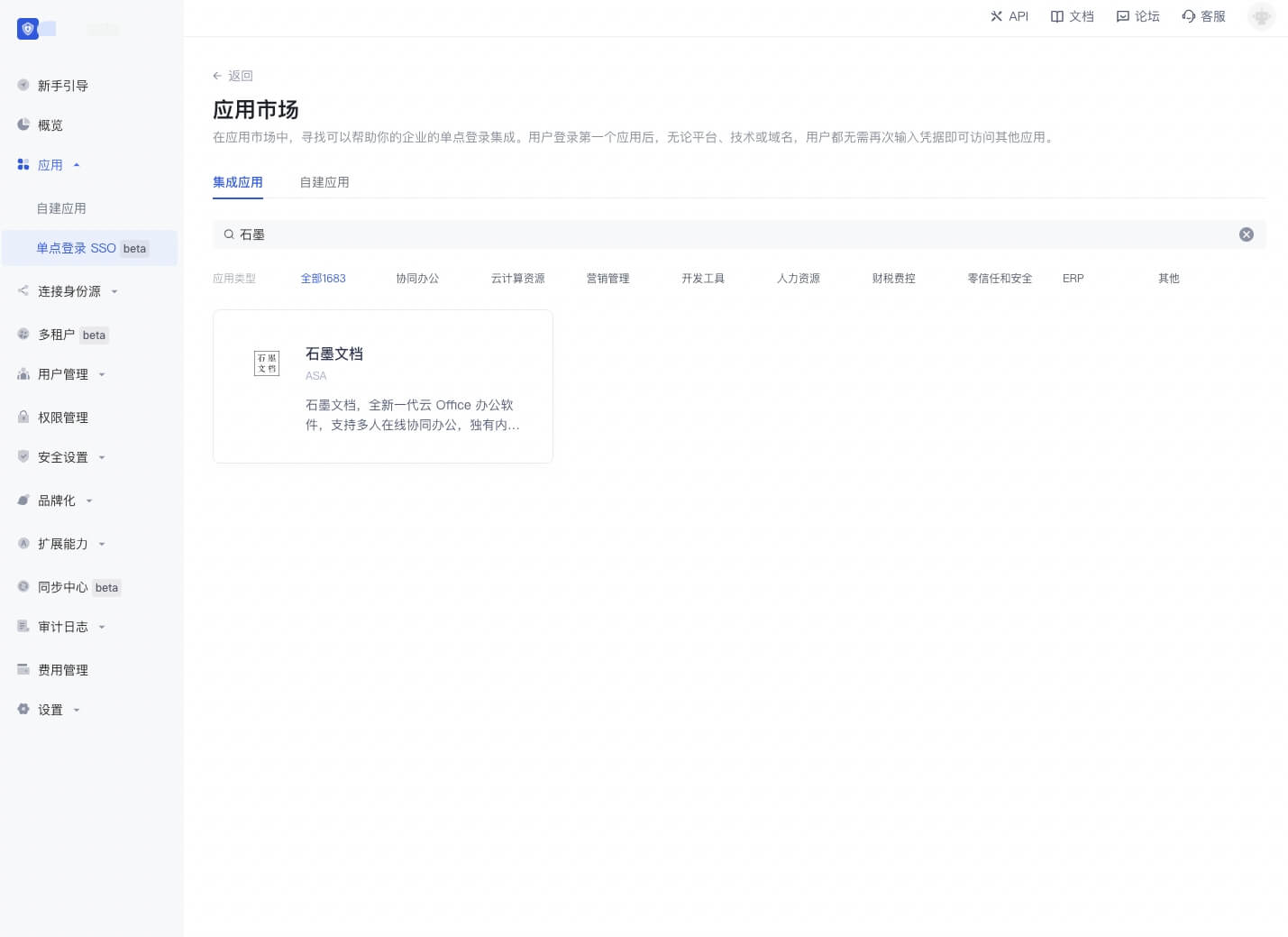 在 Authing 应用市场找一个支持 ASA 的应用,以下我们以「石墨文档」为例进行演示。