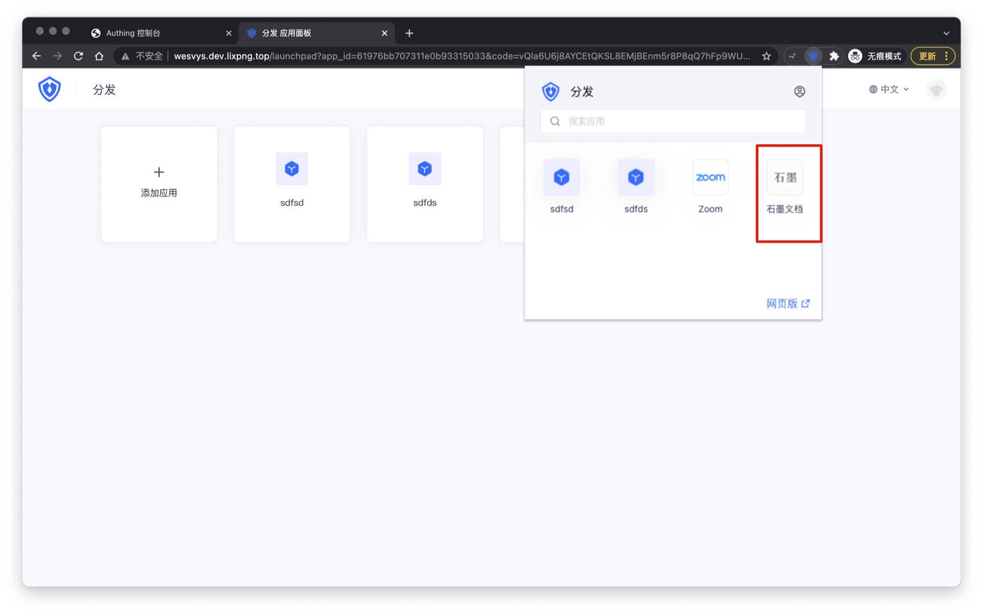 插件中会展示当前账号被管理员所分配的所有应用列表,你可以看到你之前添加的「石墨文档」。