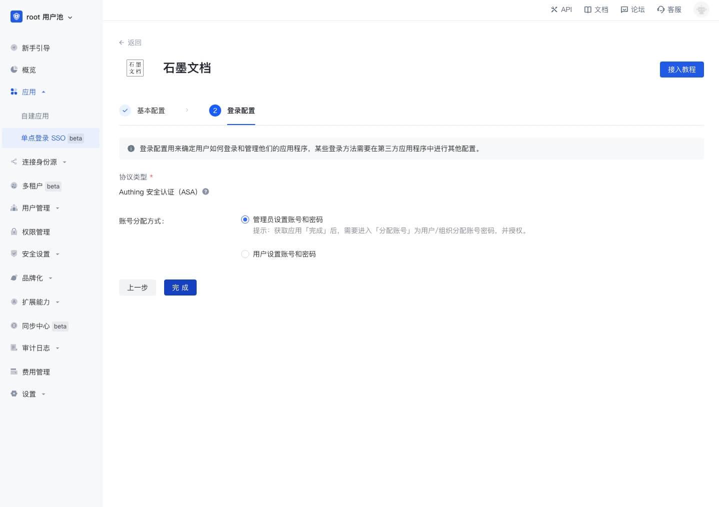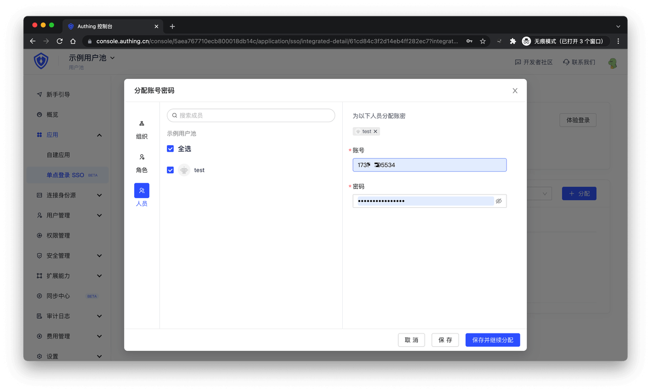 点击「完成」,在分配账号页面,给用户分配应用账号