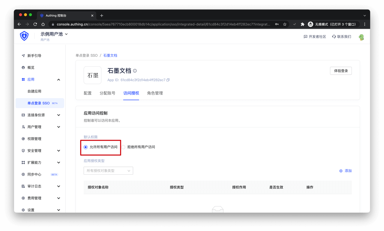 在访问授权页面,选择「允许所有用户访问」