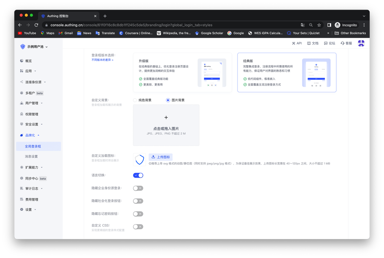 你可以在 Authing 控制台的「品牌化」功能区对整个用户池的登录框进行个性化的配置,包括「单点登录 SSO」的登录框以及用户池内所有自建应用的登录框。