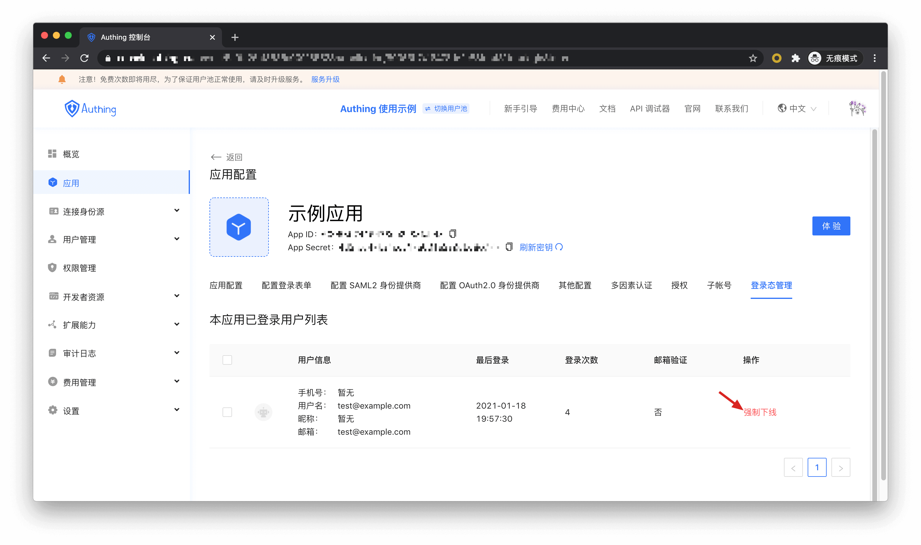 POSThttps://<你的应用域名>.authing.cn/api/v2/applications/:appId/kick-active-users - 请求头: