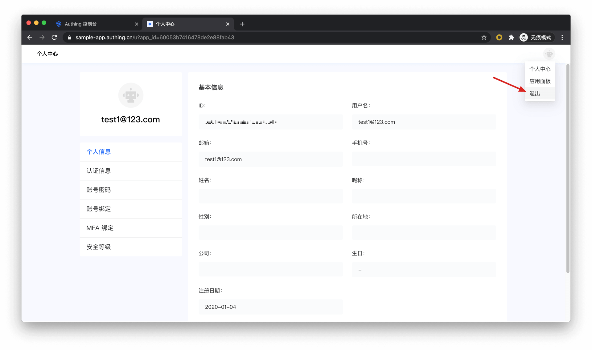 - 从个人中心退出:此方式适合你使用 Authing 托管的在线个人中心的场景;