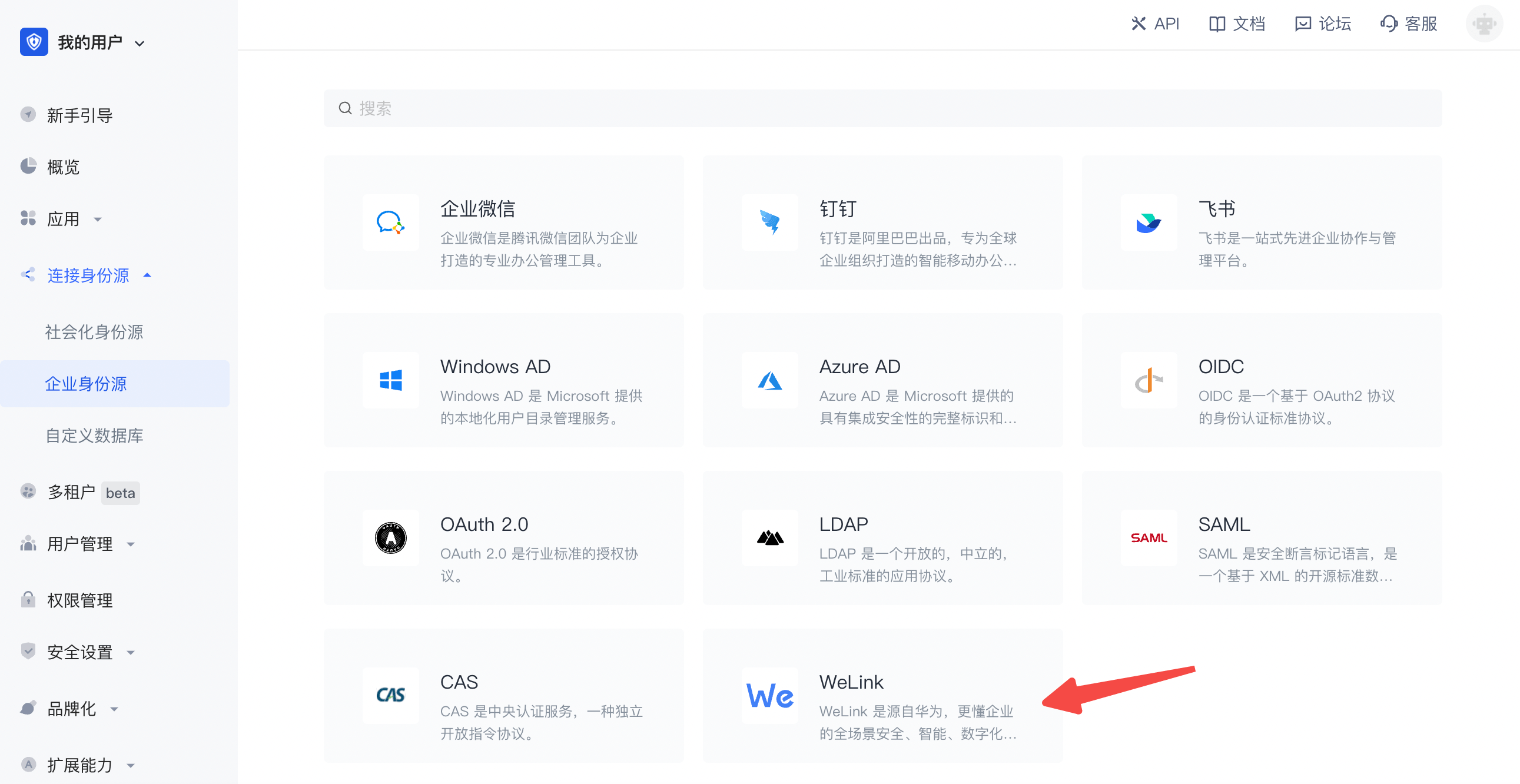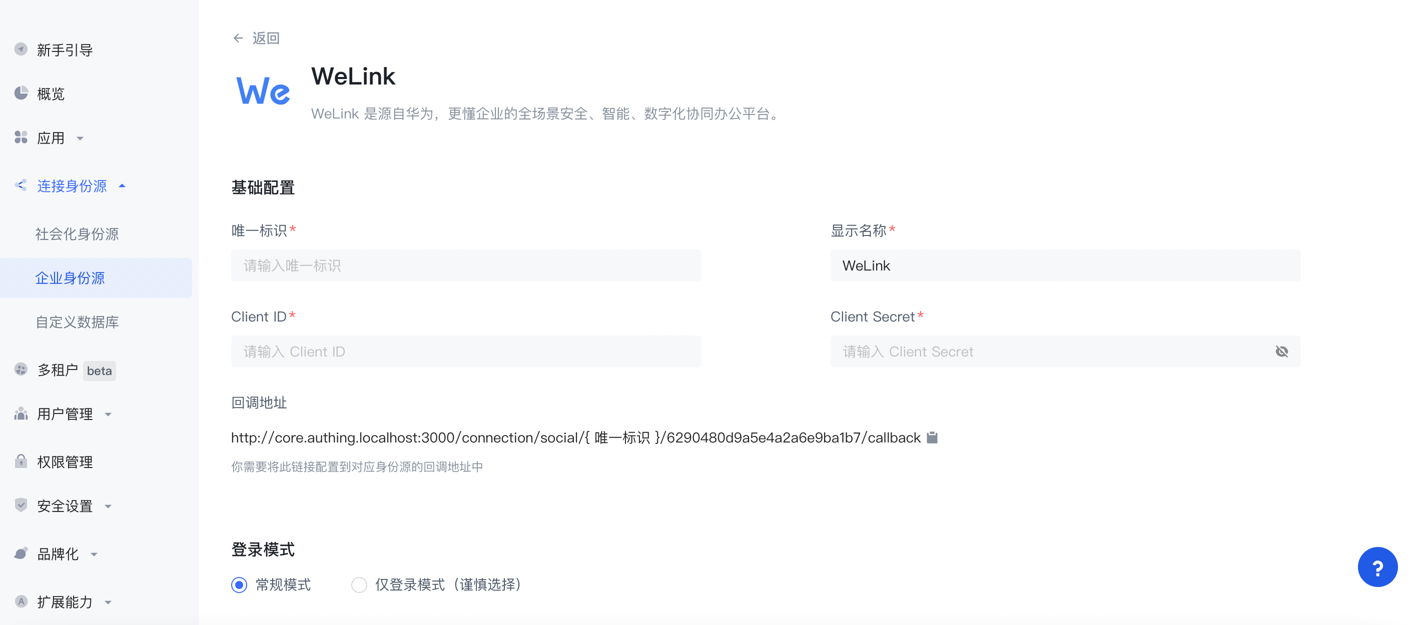 2.2 请在 Authing 控制台 的「企业身份源」-「选择企业身份也」页面,点击「WeLink」身份源按钮,进入 「WeLink 登录模式」页面。