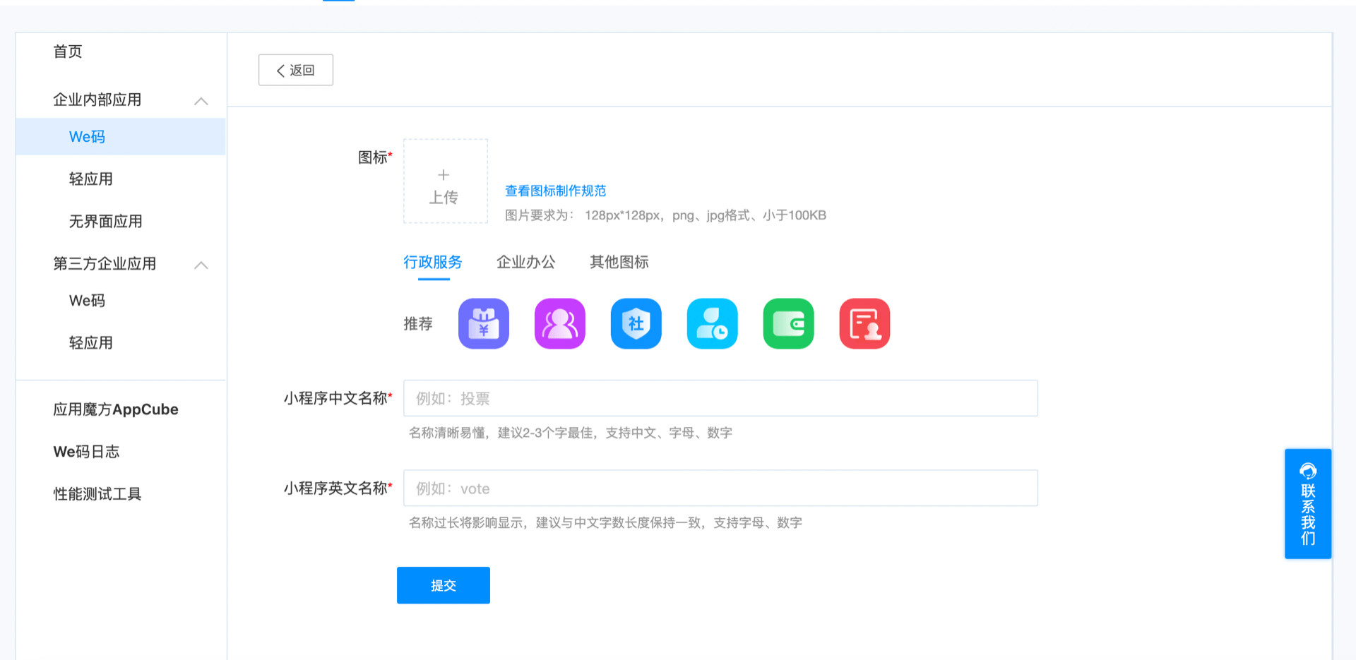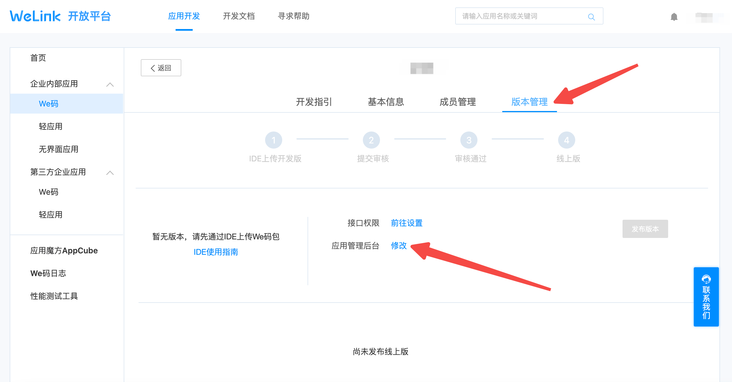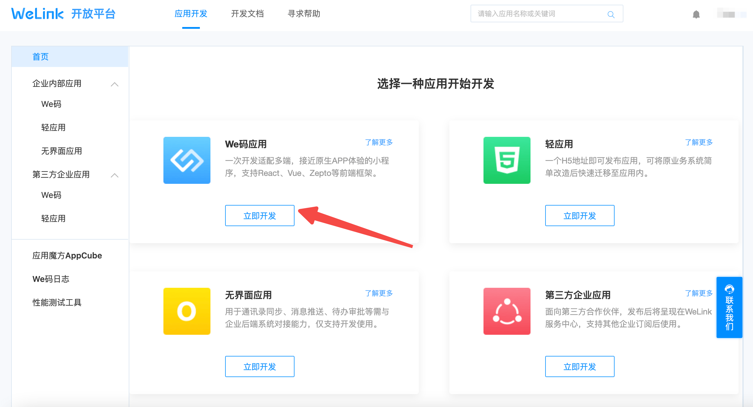 前往 WeLink后台 (opens new window),创建We码应用。