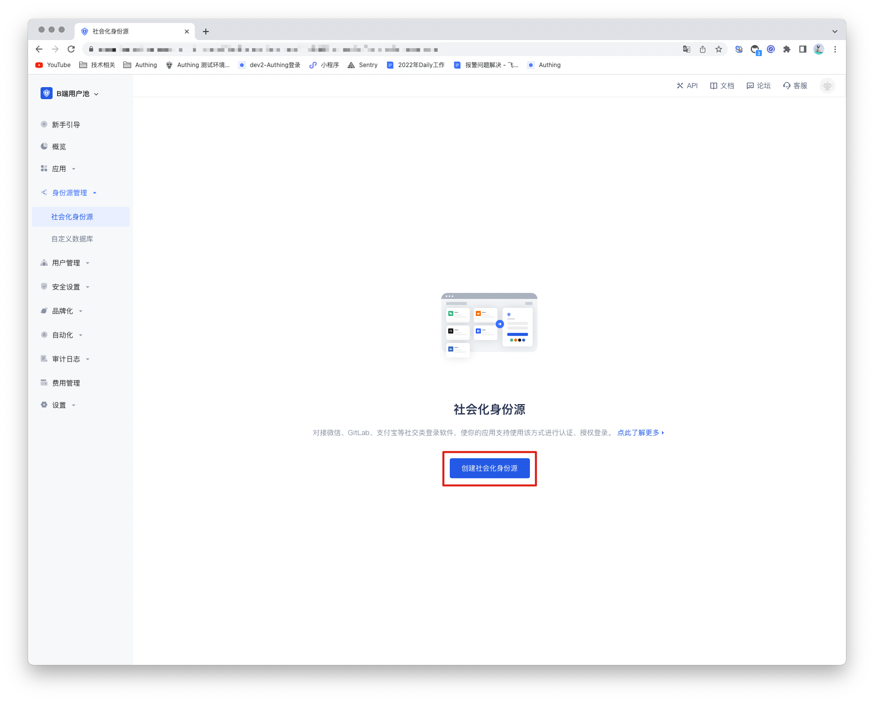 2.1 请在 Authing Console 控制台 的「社会化身份源」页面,点击「创建社会化身份源」按钮,进入「选择社会化身份源」页面。
