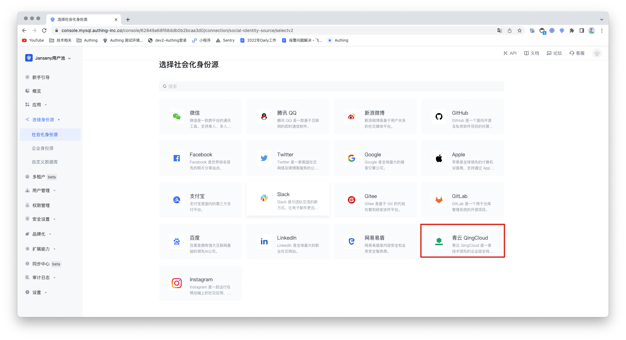 2.2 在所有社交身份源图标中,找到并进入 QingCloud 社会化登录。