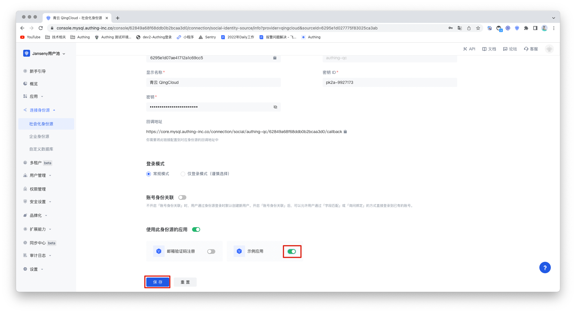 2.3 请在 Authing Console 控制台 的「社会化身份源」-「QingCloud」页面,配置相关的字段信息。