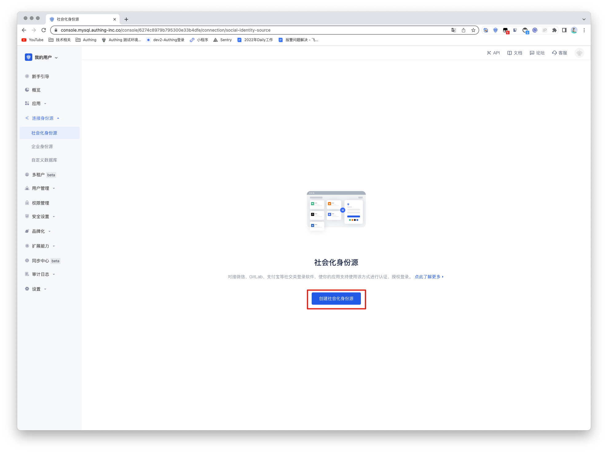 2.1 请在 Authing 控制台 (opens new window)中,进入「社会化身份源」配置页面,点击「创建社会化身份源」开始选择与创建。