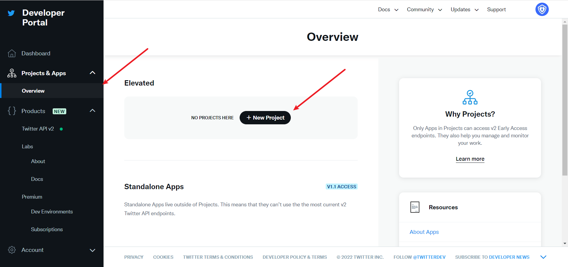 1.1 创建一个项目,在侧边栏 Projects & Apps,选择 Overview,在 Elevated 目录下,点击 +New Project。