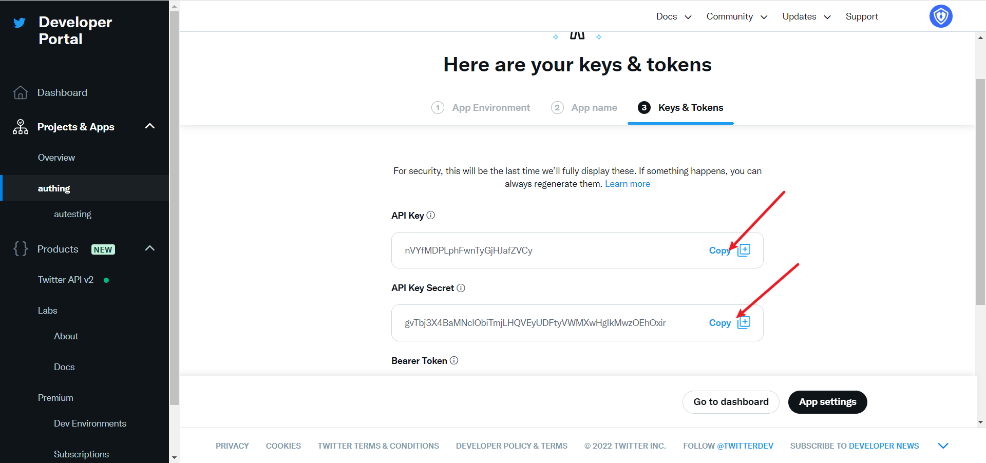 | 2.3.4 | API Secret Key | 应用密钥,需要在 Twitter 平台上获取 |