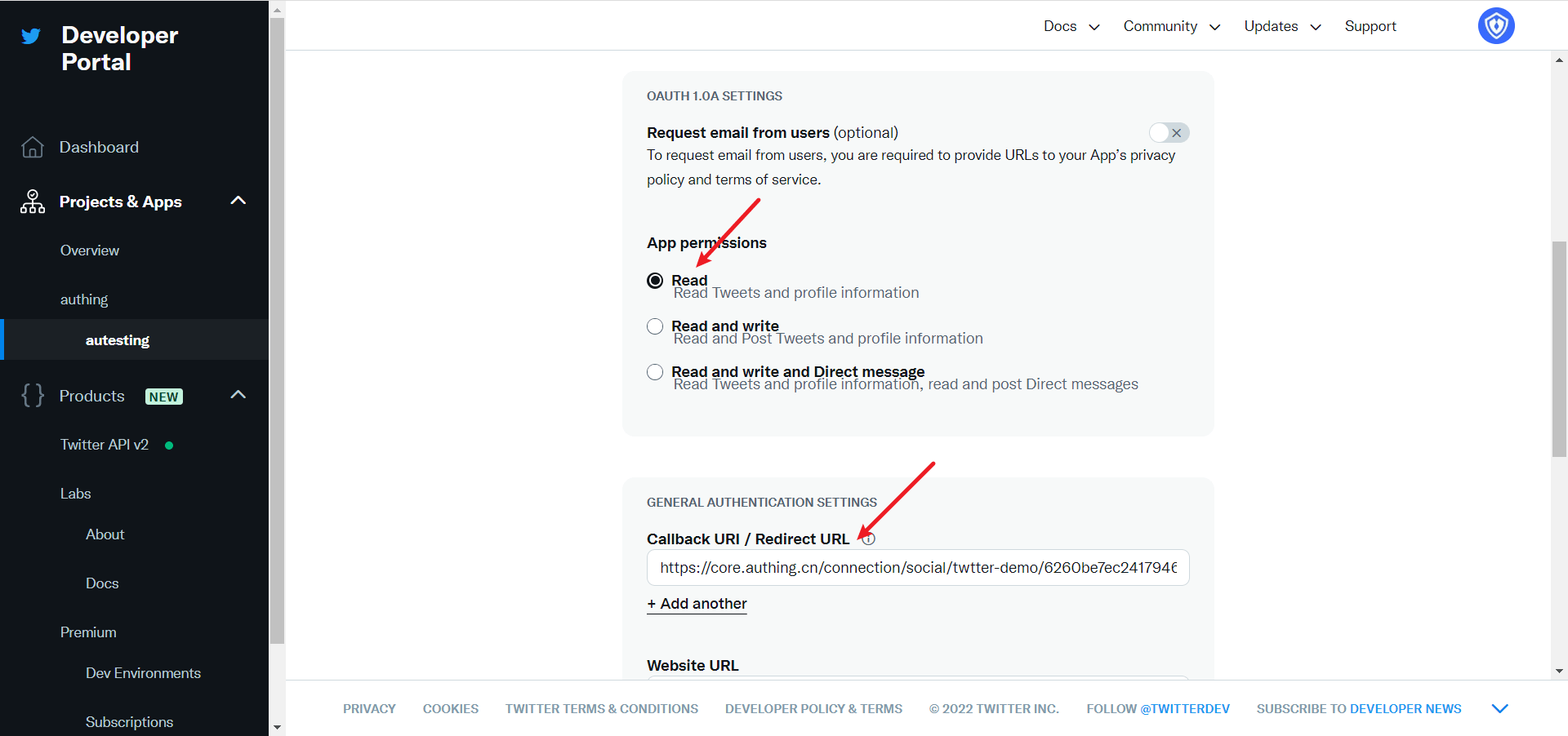 根据需要选择 App 的权限,默认选择 Read,就可以满足认证功能,Callback URI / Redirect URL填写在 Authing 控制台上创建 Twitter 身份源后,所展示的回调地址。