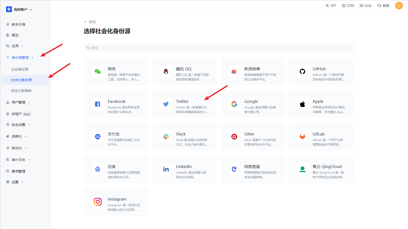 2.1 请在 Authing Console 控制台 的「社会化身份源」页面,点击「创建社会化身份源」按钮,进入「选择社会化身份源」页面,选择「Twitter」身份源按钮,进入 「Twitter 登录模式」页面。