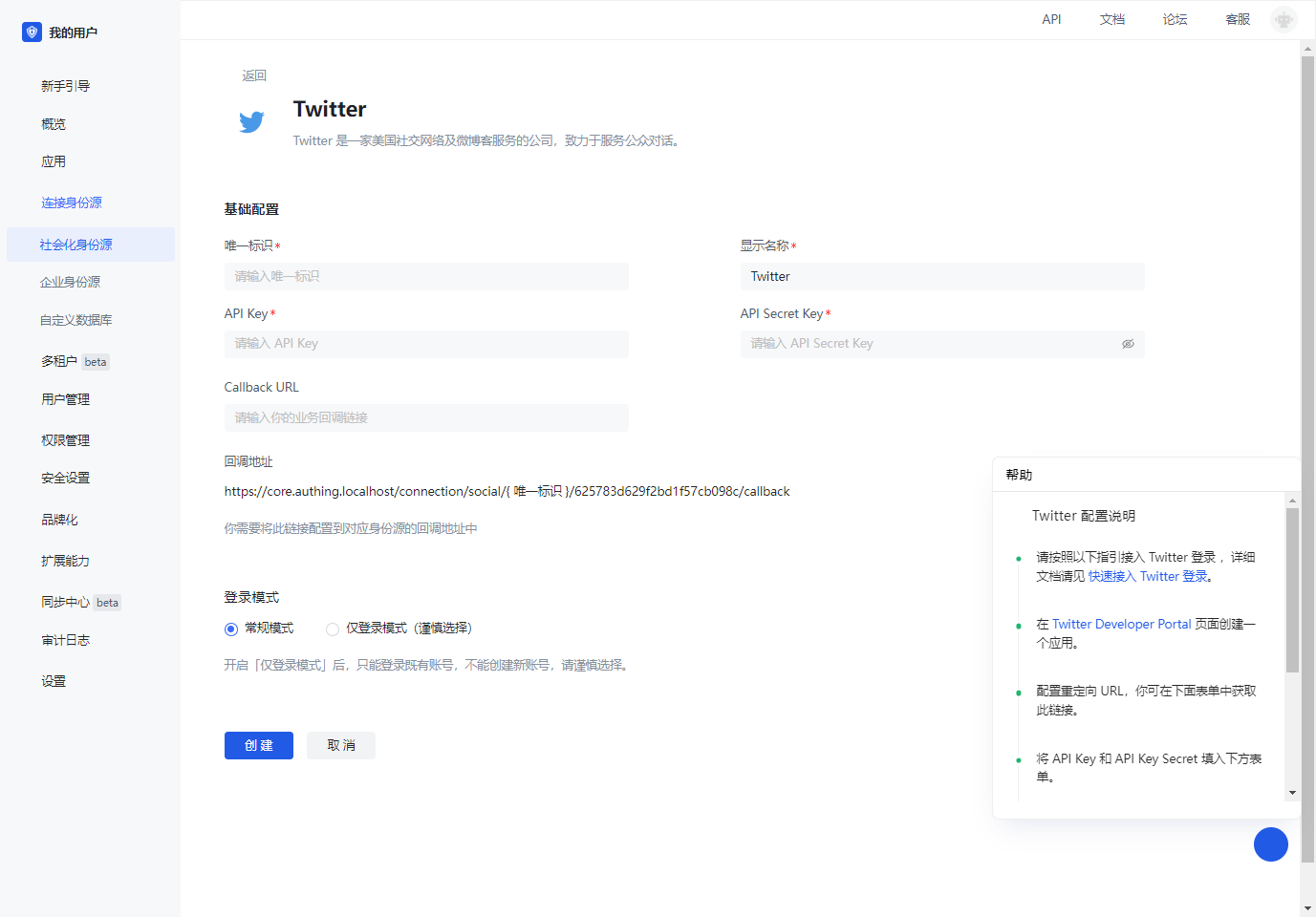 2.3 请在 Authing Console 控制台 的「社会化身份源」-「Twitter」页面,配置相关的字段信息。