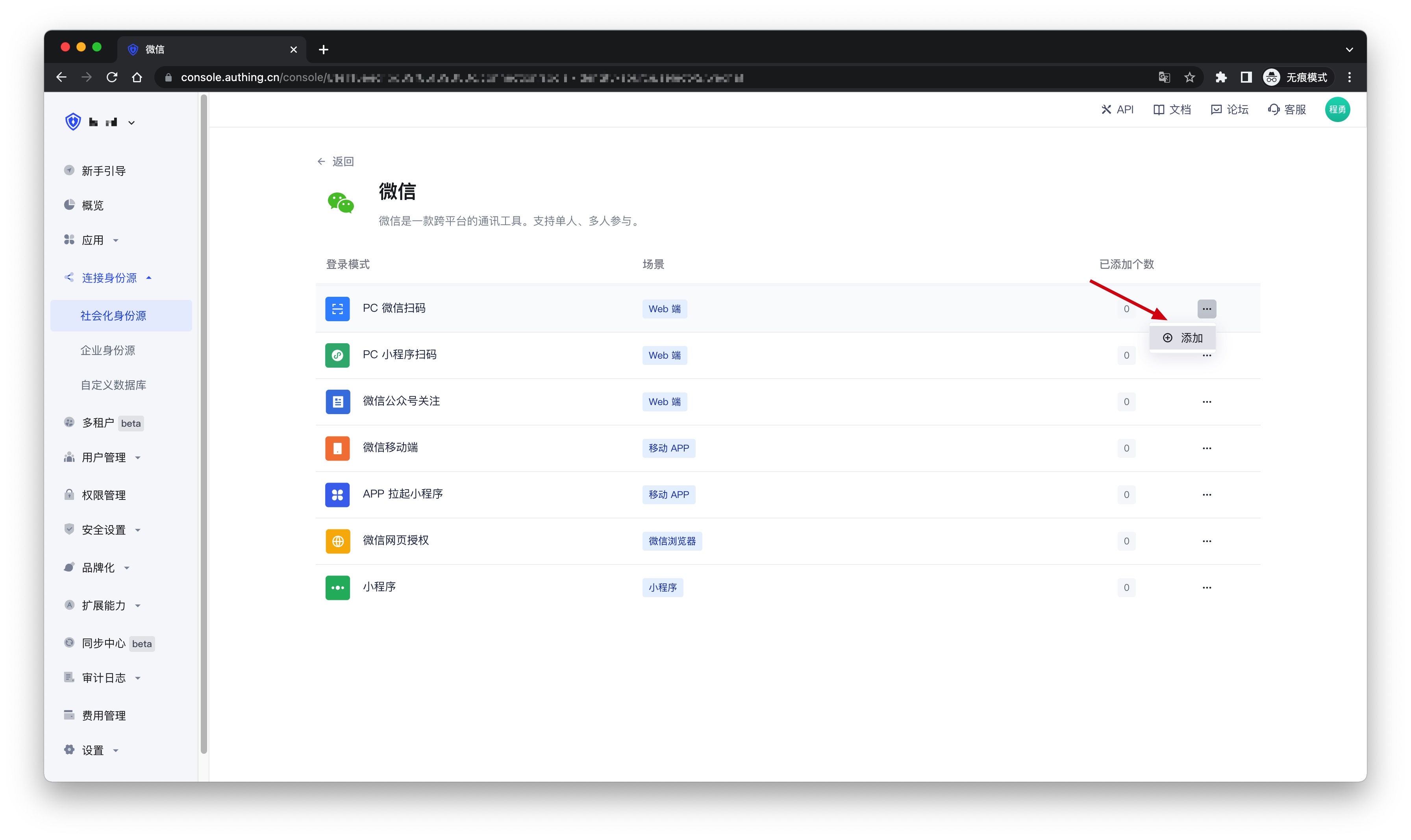 2.3 继续点击 PC 微信扫码 登录模式,或者点击 添加 打开 PC 微信扫码 配置页面。
