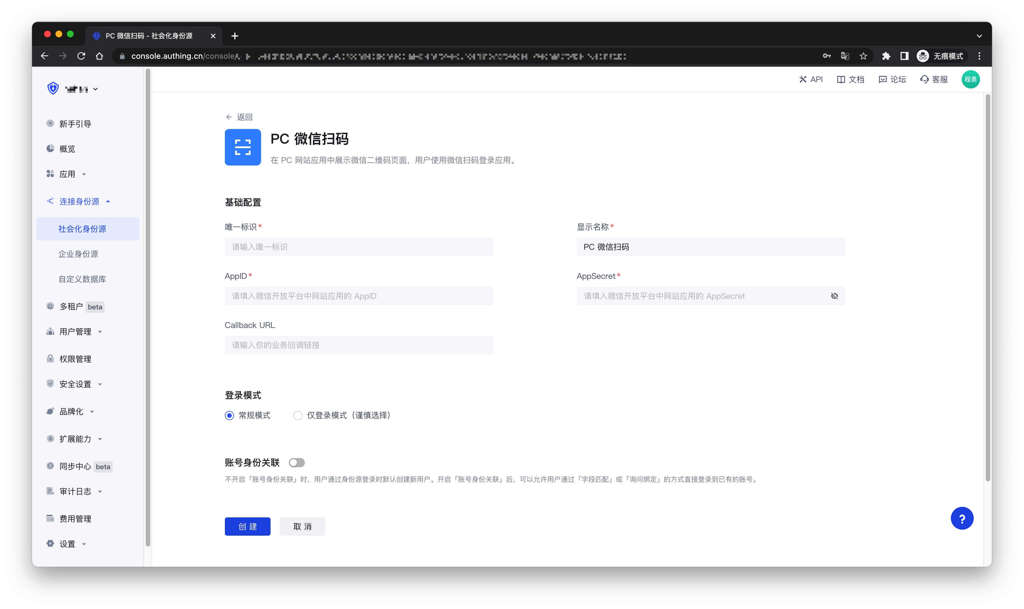 2.4 在 PC 微信扫码 配置页面,填写相关的字段信息。