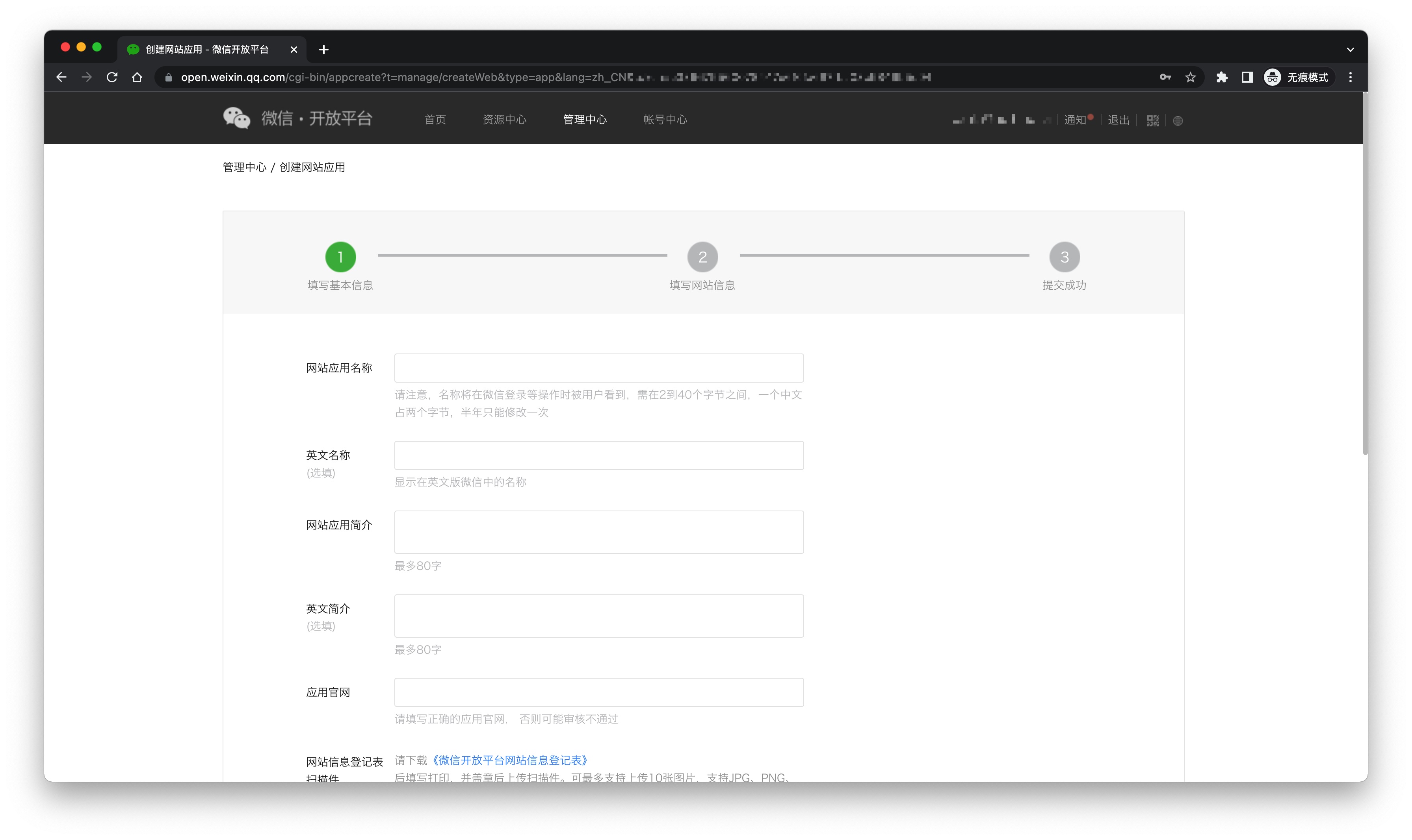 前往微信开放平台 (opens new window),点击 管理中心 -> 网站应用 -> 创建网站应用。创建完成之后,你需要记录下该应用的 AppID 和 AppSecret,后面需要用到。