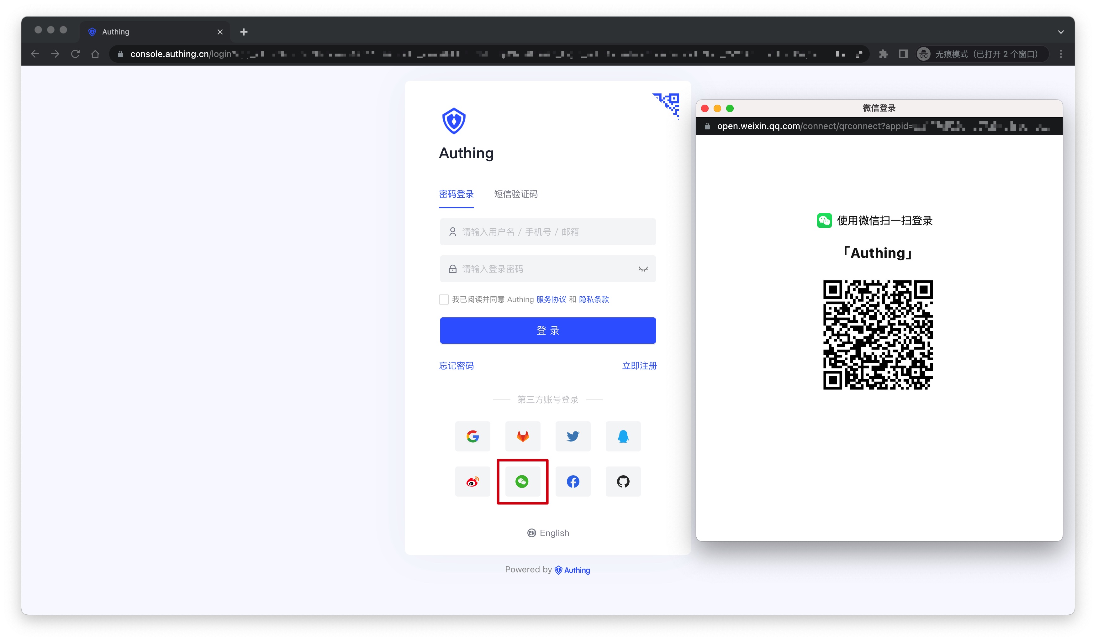 3.3 点击 Authing 控制台的应用 体验登录 按钮,在弹出的登录窗口体验 PC 微信扫码 登录