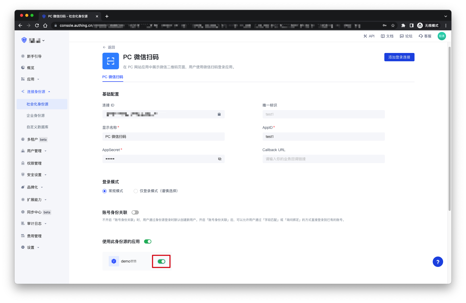 3.2 在已创建好的 PC 微信扫码 身份源连接详情页面,开启并关联一个在 Authing 控制台创建的应用