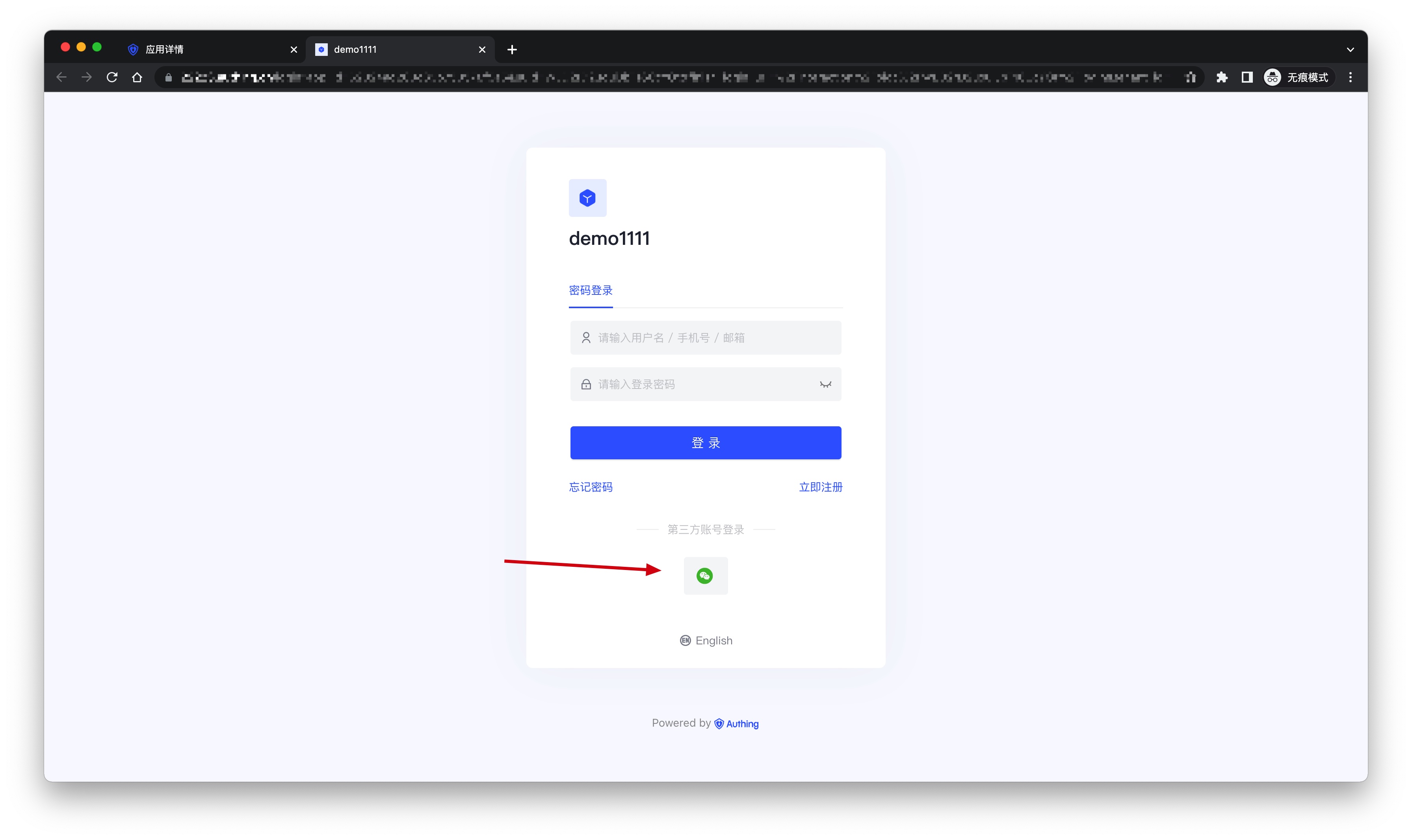 请确保该应用获取到了微信登录的权限,并将授权回调域设置为 core.authing.cn