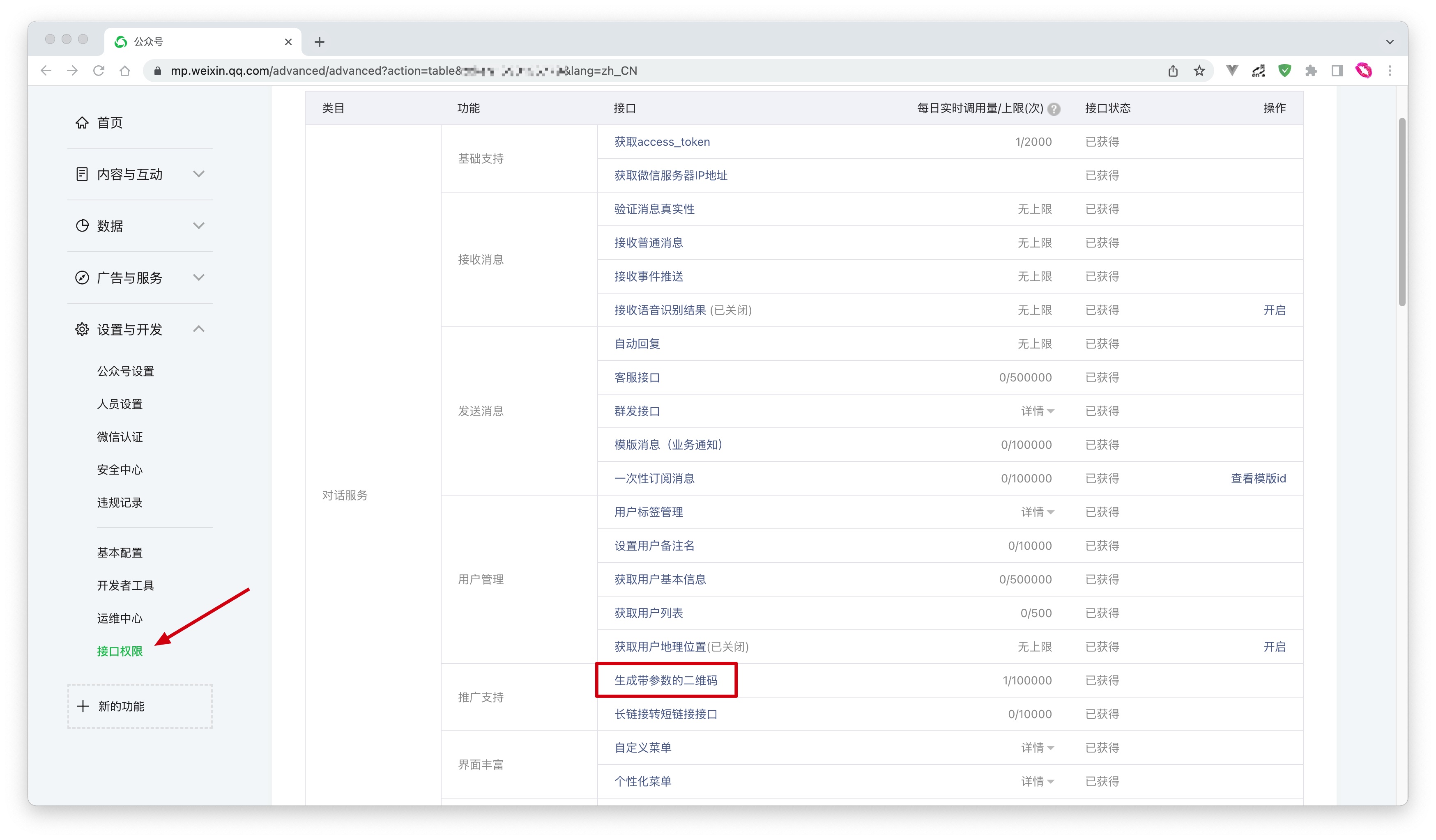 你需要在微信公众号平台的设置与开发-接口权限页面添加生成带参数的二维码 (opens new window)接口权限: