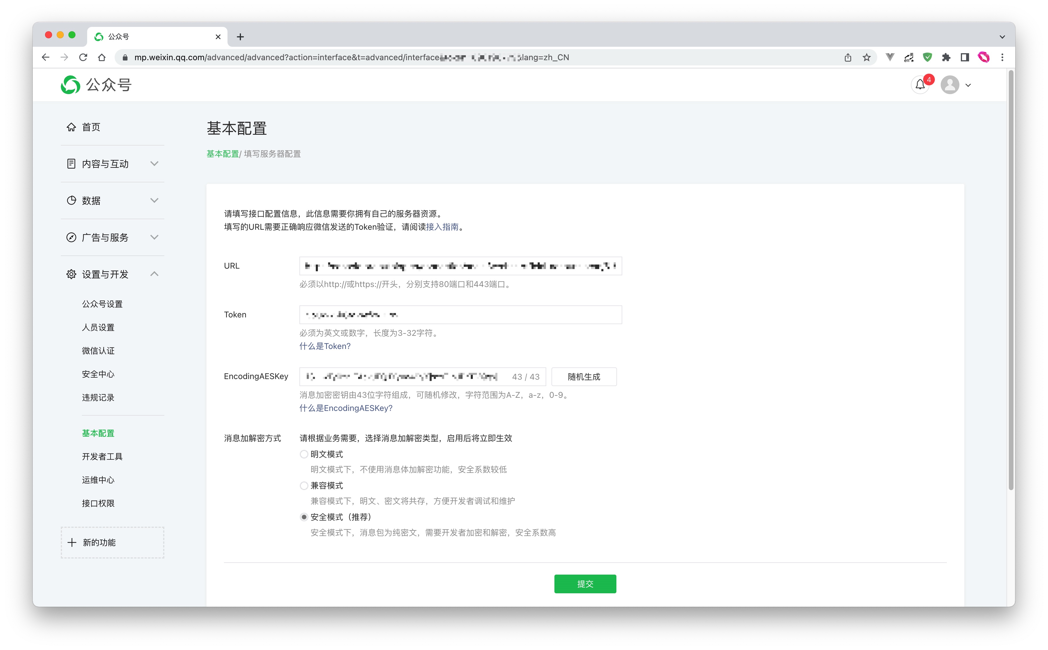 - 消息加解密方式:请根据业务需要选择,推荐使用安全模式。
