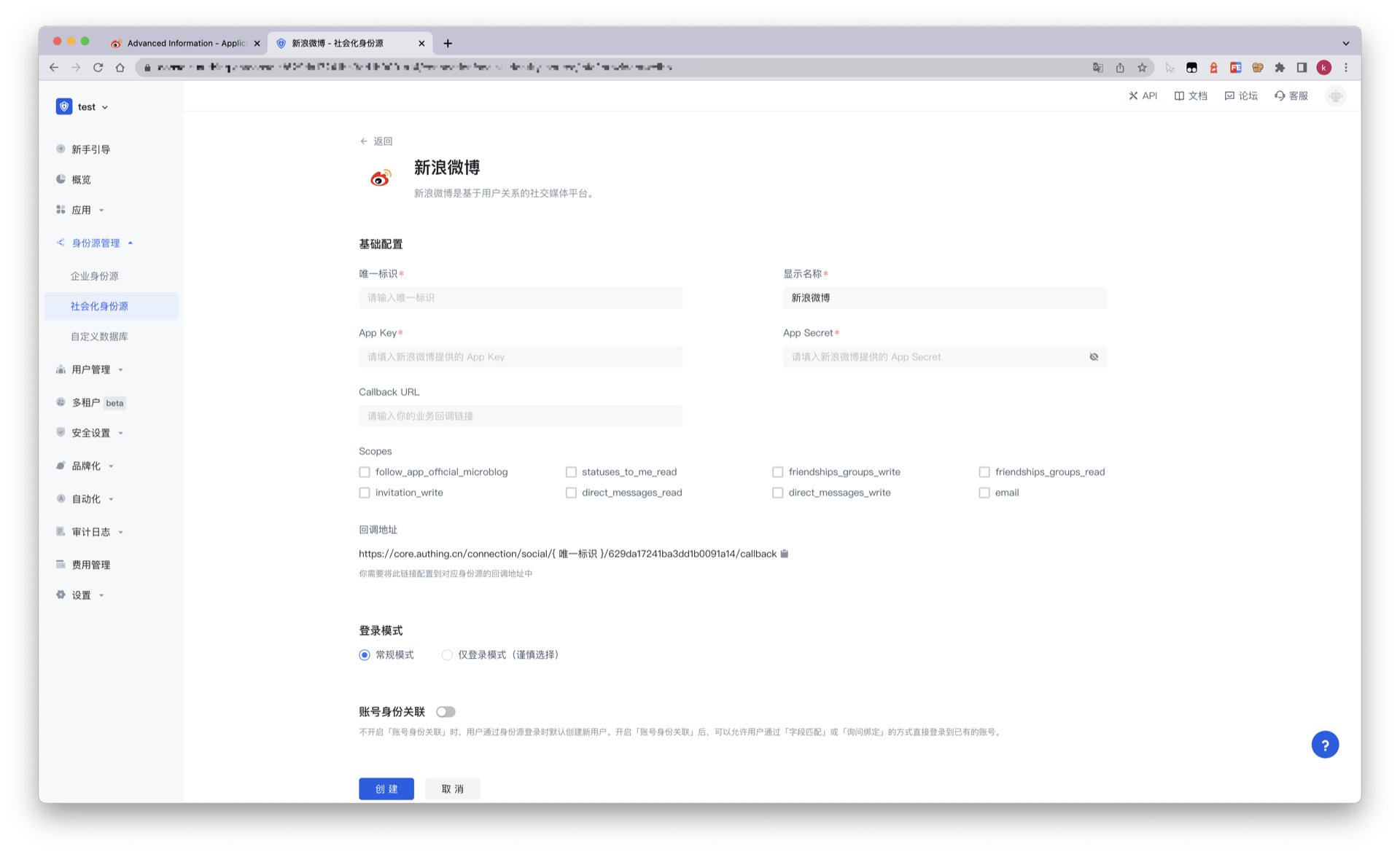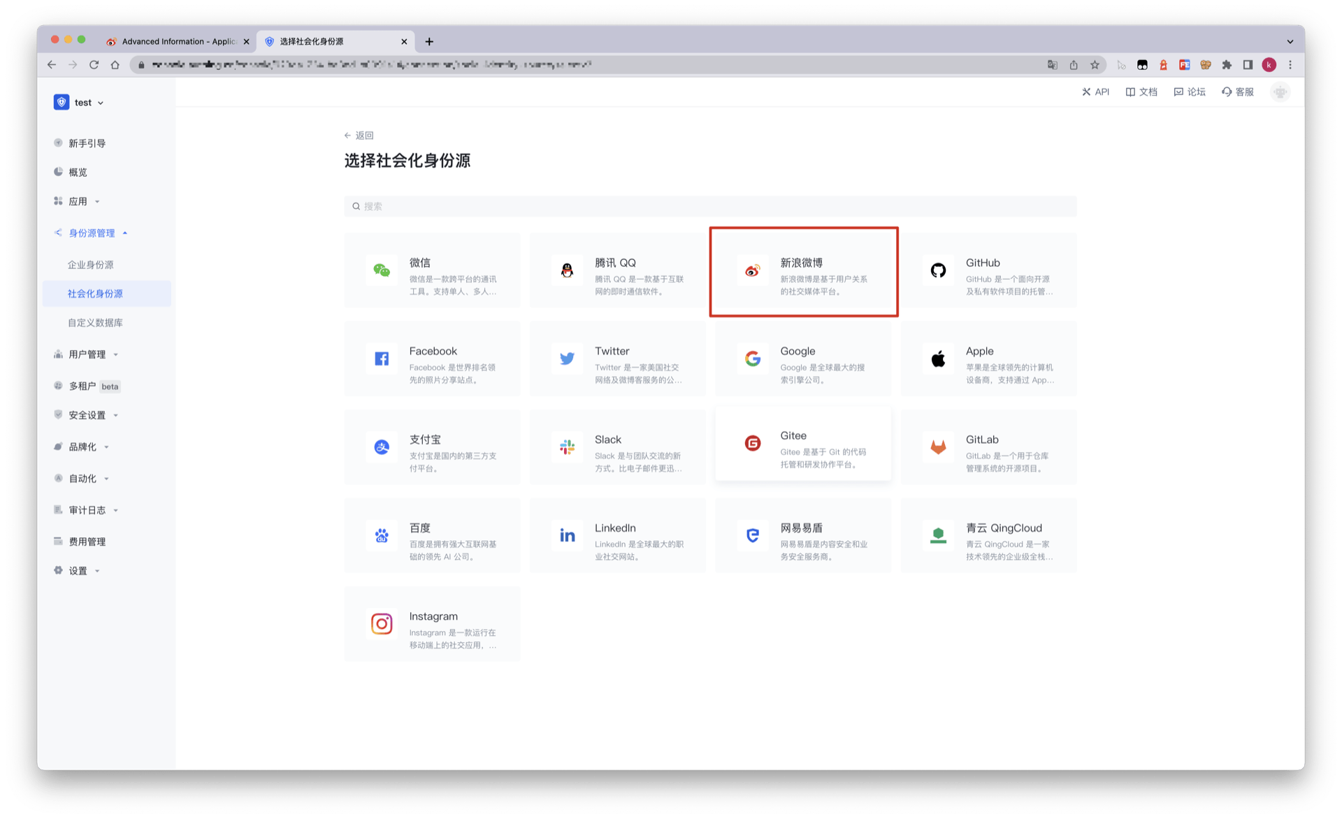 2.2 请在 Authing 控制台 的「社会化身份源」-「选择社会化身份也」页面,点击「新浪微博」身份源按钮,进入 「新浪微博登录模式」页面。