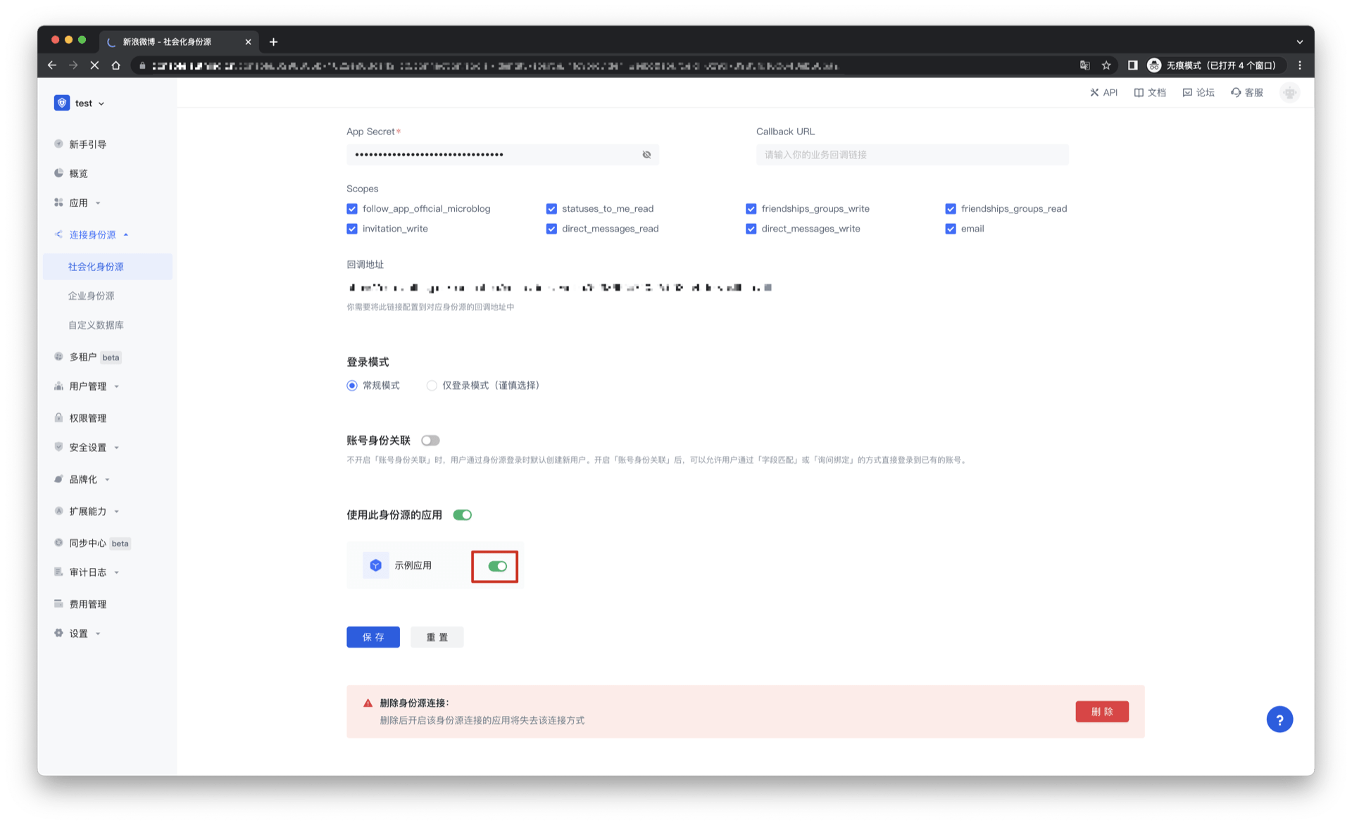 3.2 在已创建好的新浪微博身份源连接详情页面,开启并关联一个在 Authing 控制台创建的应用
