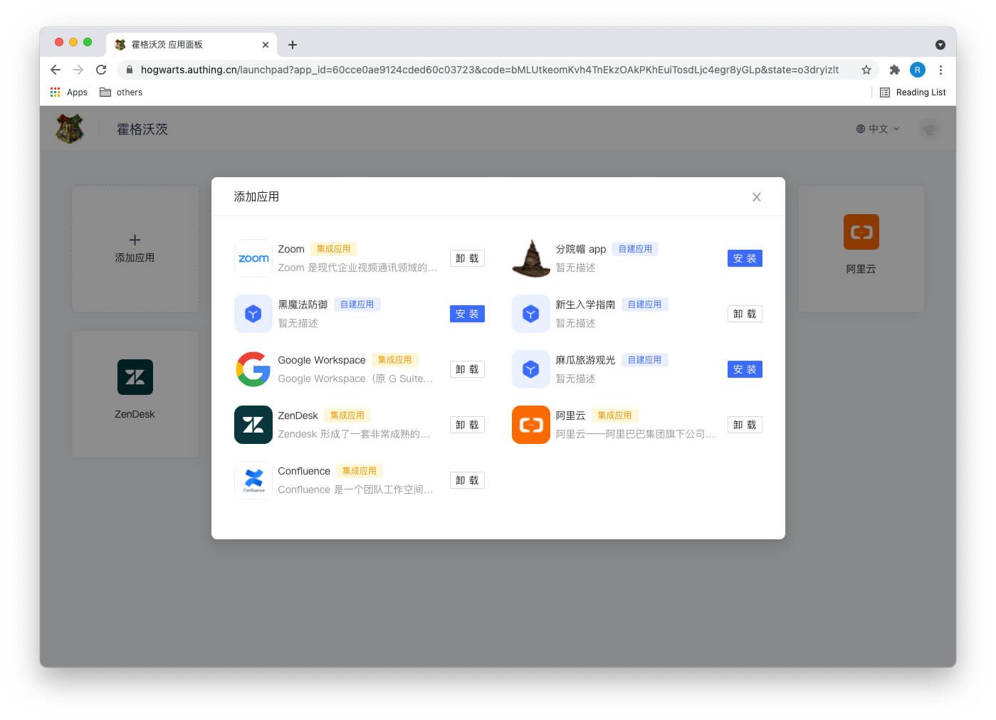 Authing 应用面板用于展示企业所需的各类应用,是提供员工单点登录、提高工作效率、保证信息安全的好地方。