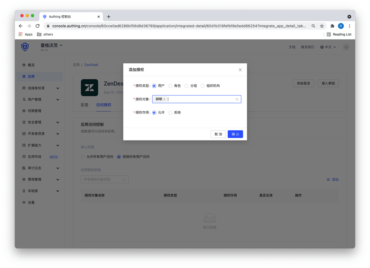 企业管理员或具有 Authing 控制台权限的管理员(管理员及添加协作管理员详情可见 添加用户池协作管理员 | Authing 文档)登录 Authing > 应用 > 某应用 > 访问授权,点击 添加授权 并填写 授权对象。
