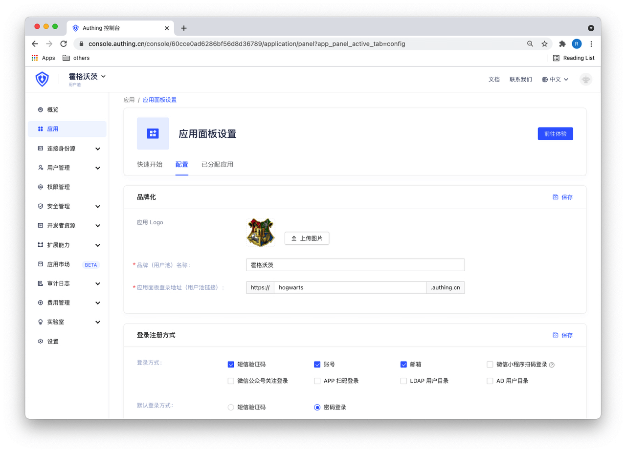企业管理员或具有 Authing 控制台权限的管理员可以进入控制台 > 应用 > 应用面板 > 配置 来配置应用面板的登录注册方式、自定义登录框样式、开启多因素认证方式等。