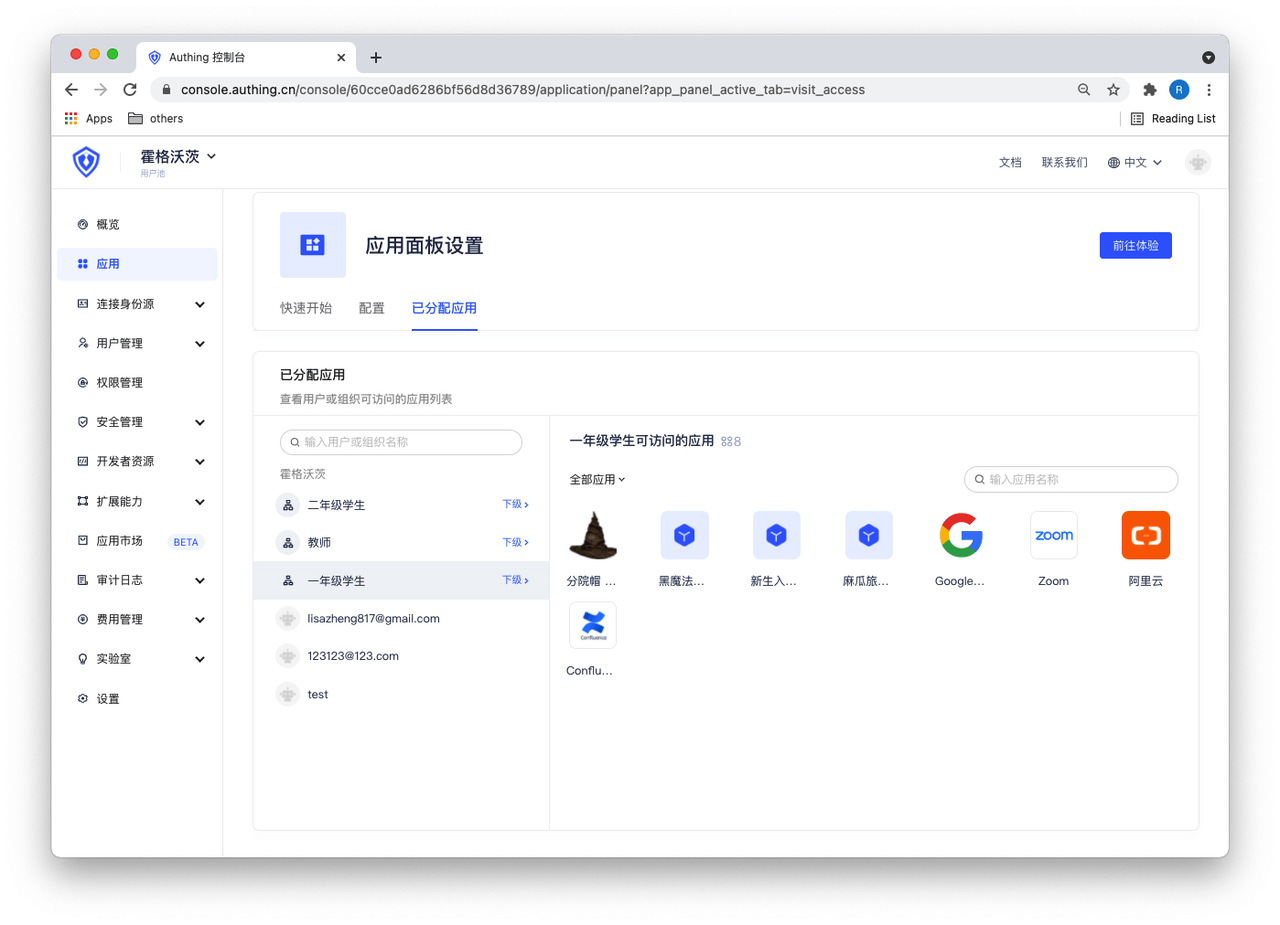 管理员可以进入控制台 > 应用 > 应用面板 > 已分配应用 来查看用户或组织可访问的应用列表。点击应用会进入应用详情页。