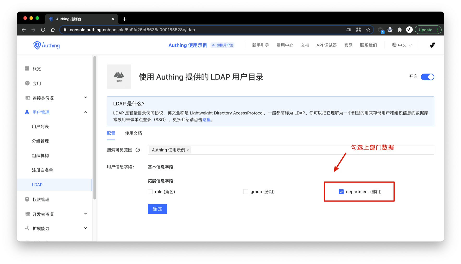 并且将 拓展信息字段 中的 department(部门) 字段勾选上: