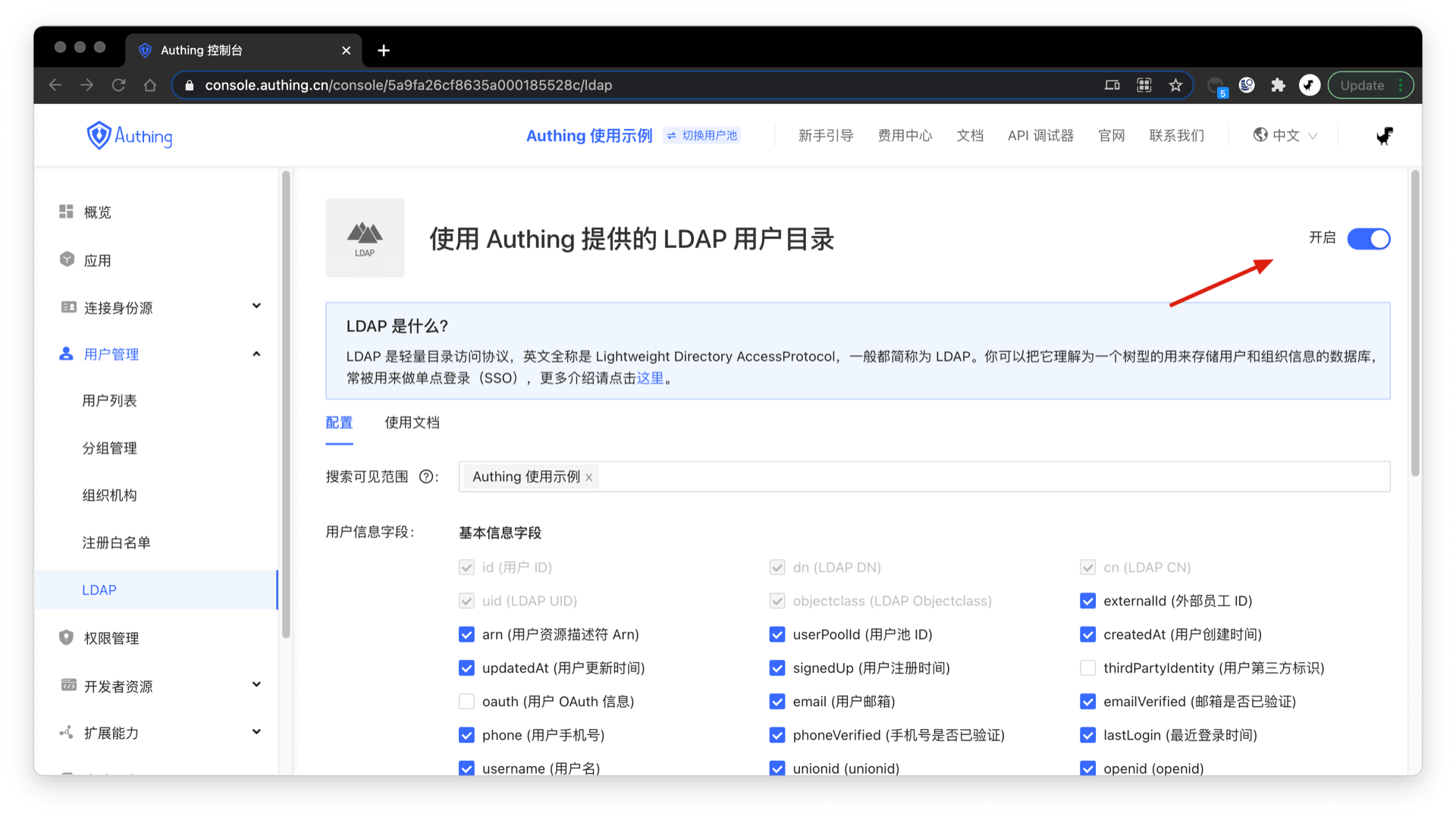 在控制台的 用户管理 - LDAP 页面,首先先开启用户池的 LDAP 用户目录: