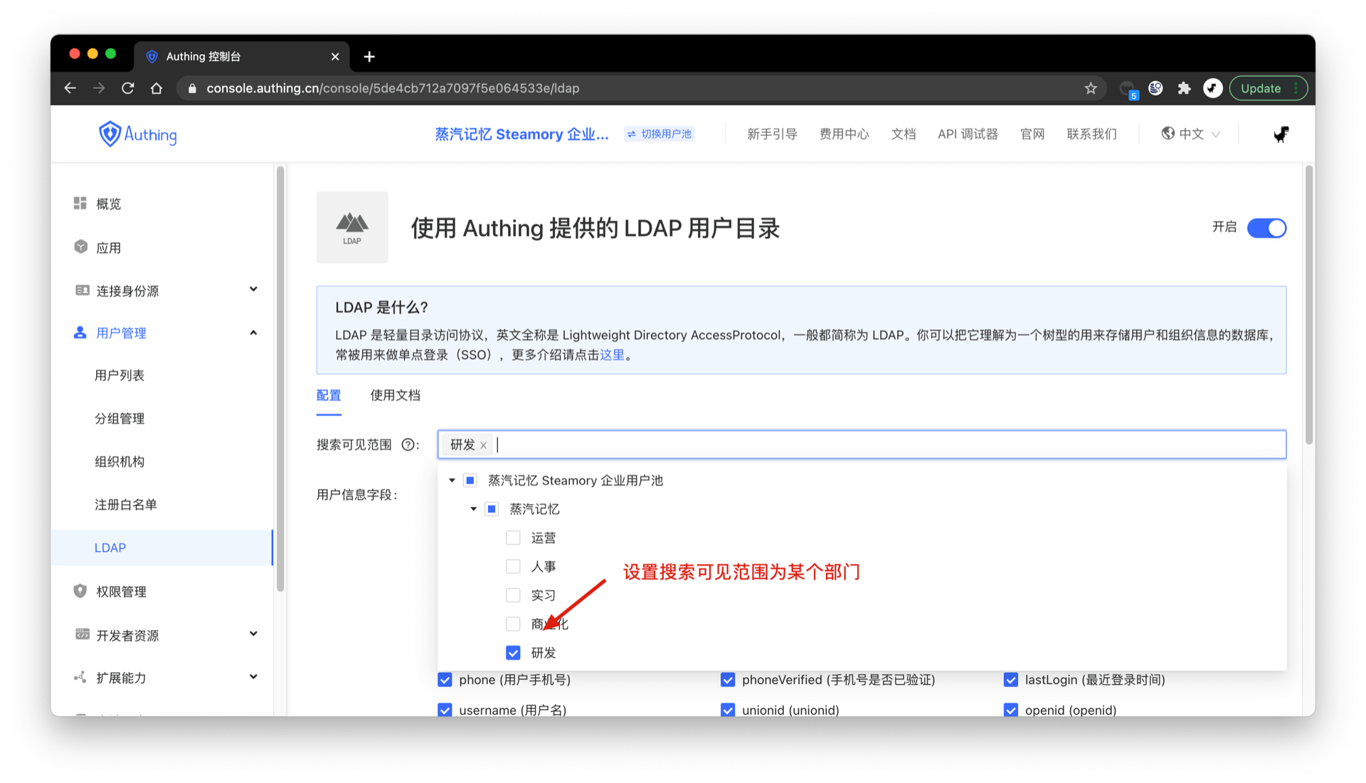 默认情况下,ldapsearch 可以获取用户池下所有组织的数据,你可以修改其可见范围为某一个部门: