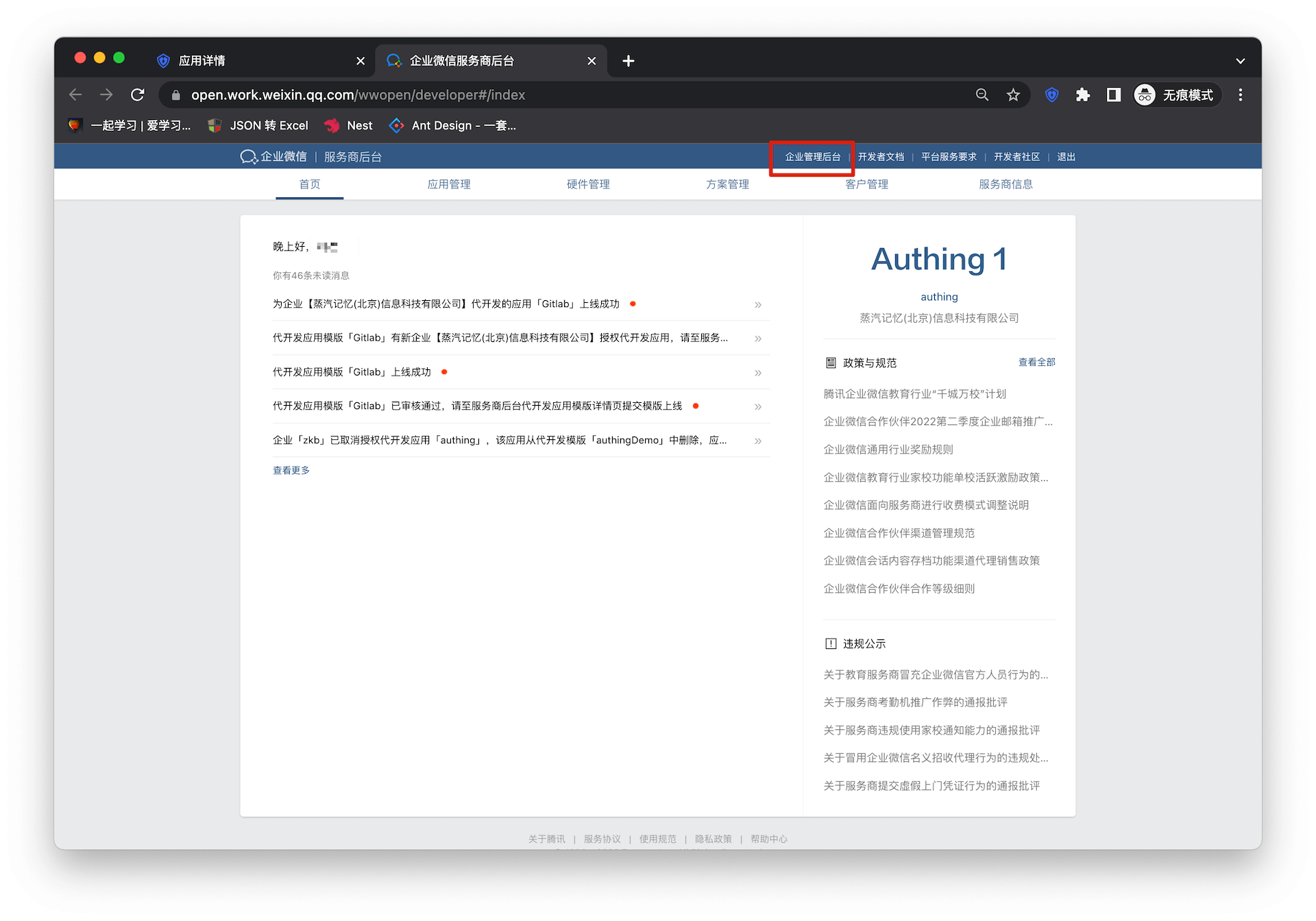 - 进入企业微信服务商后台 (opens new window),点击「企业管理后台」