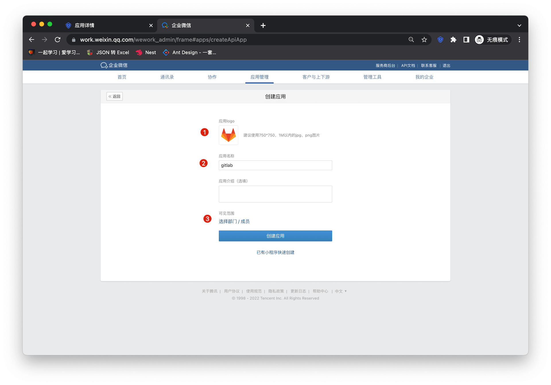 在表单中填入应用名称等基础配置信息