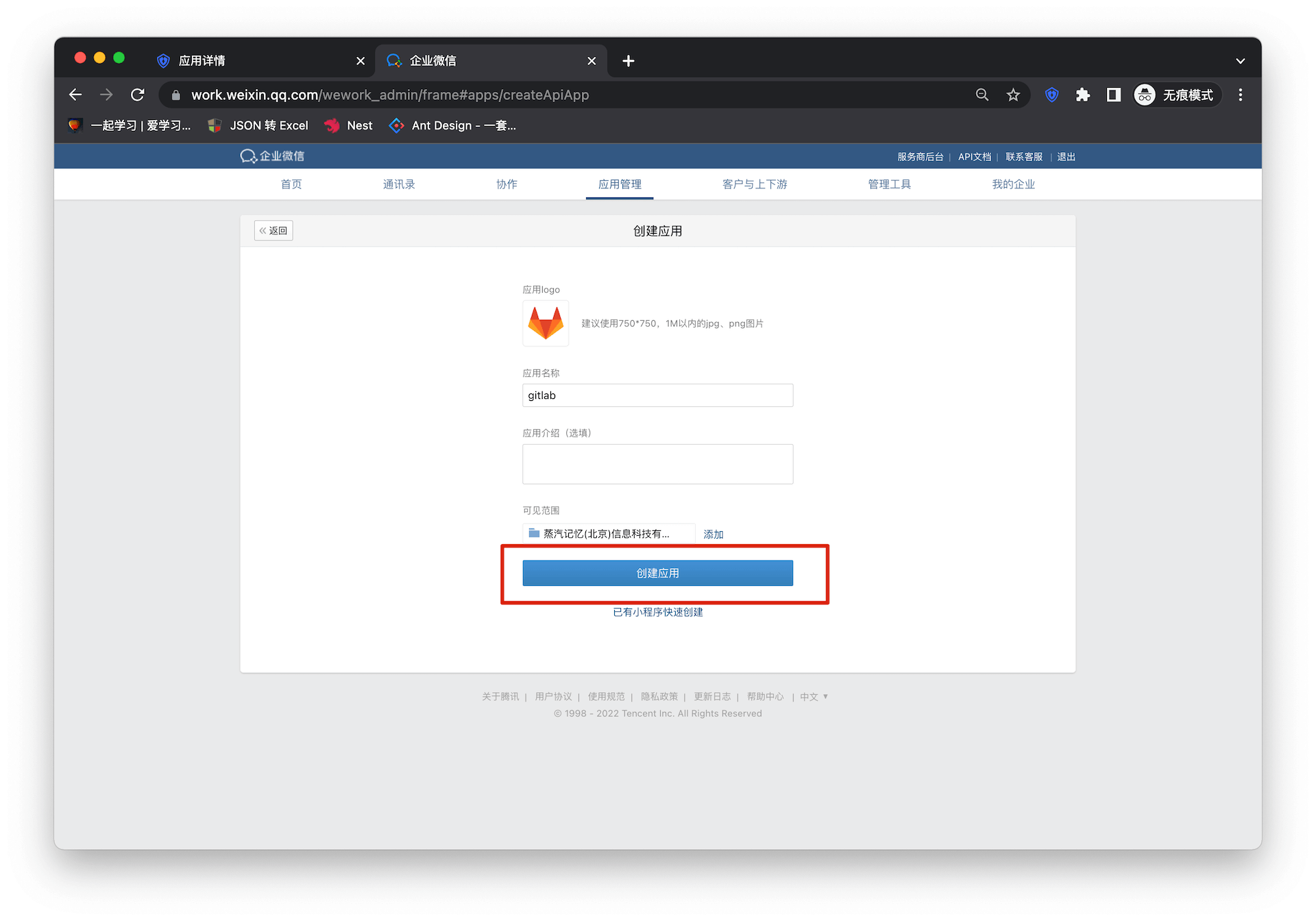 点击「创建应用」,完成应用创建