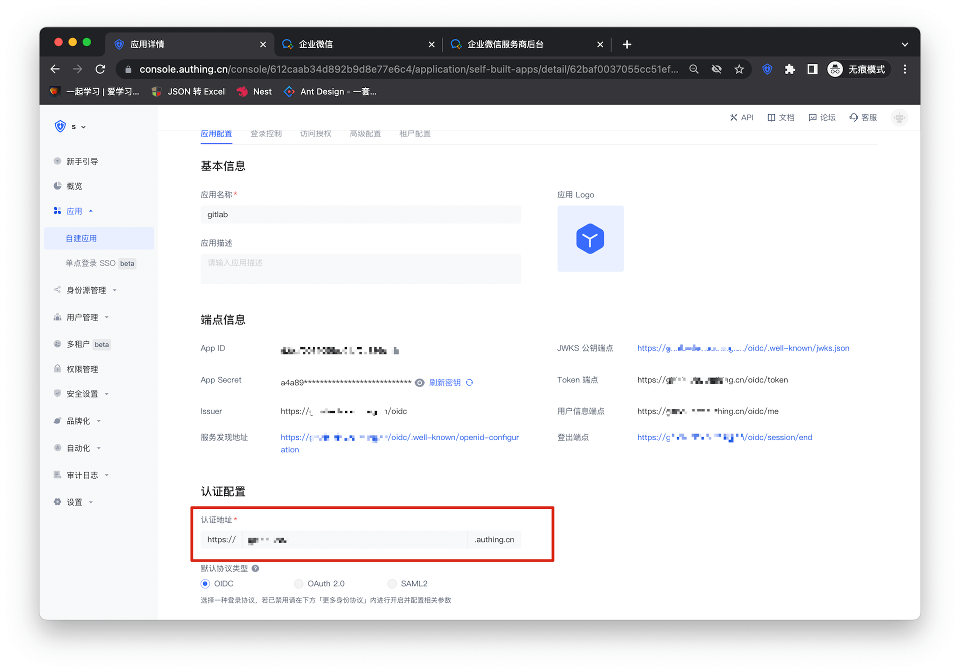 - 用户需要进入配置好的自建应用详情页,将其认证地址进行复制