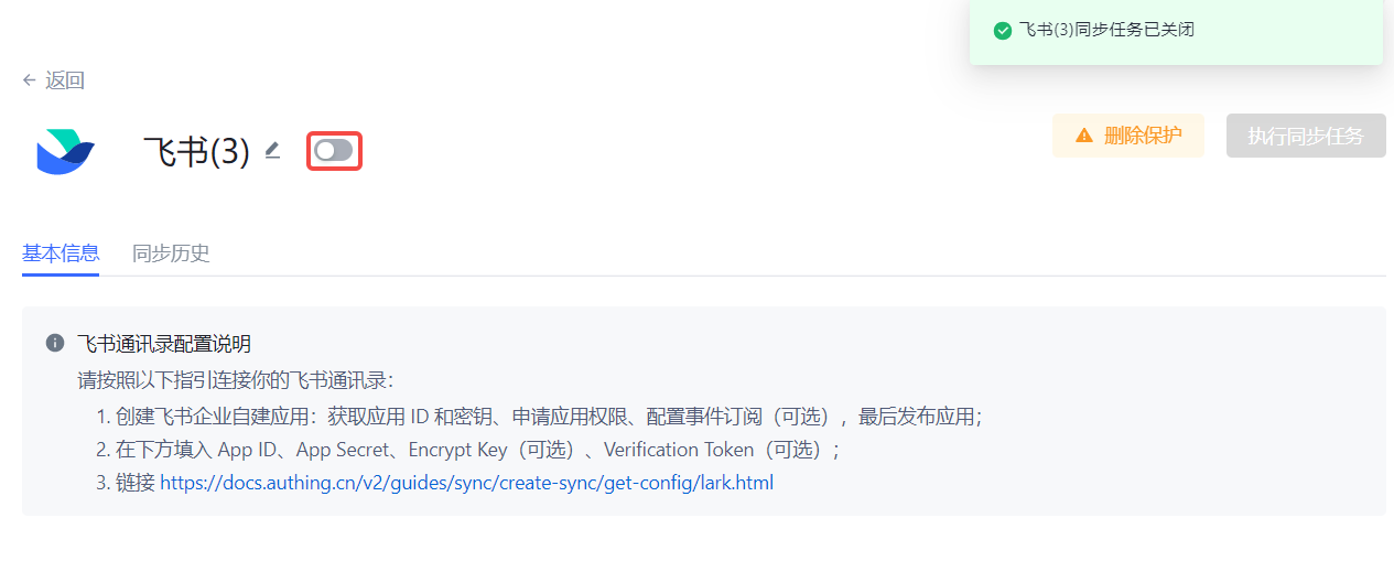 要禁用某个同步任务,可以进入该同步任务详情页,关闭该同步任务开关(同步任务创建后默认开启)。