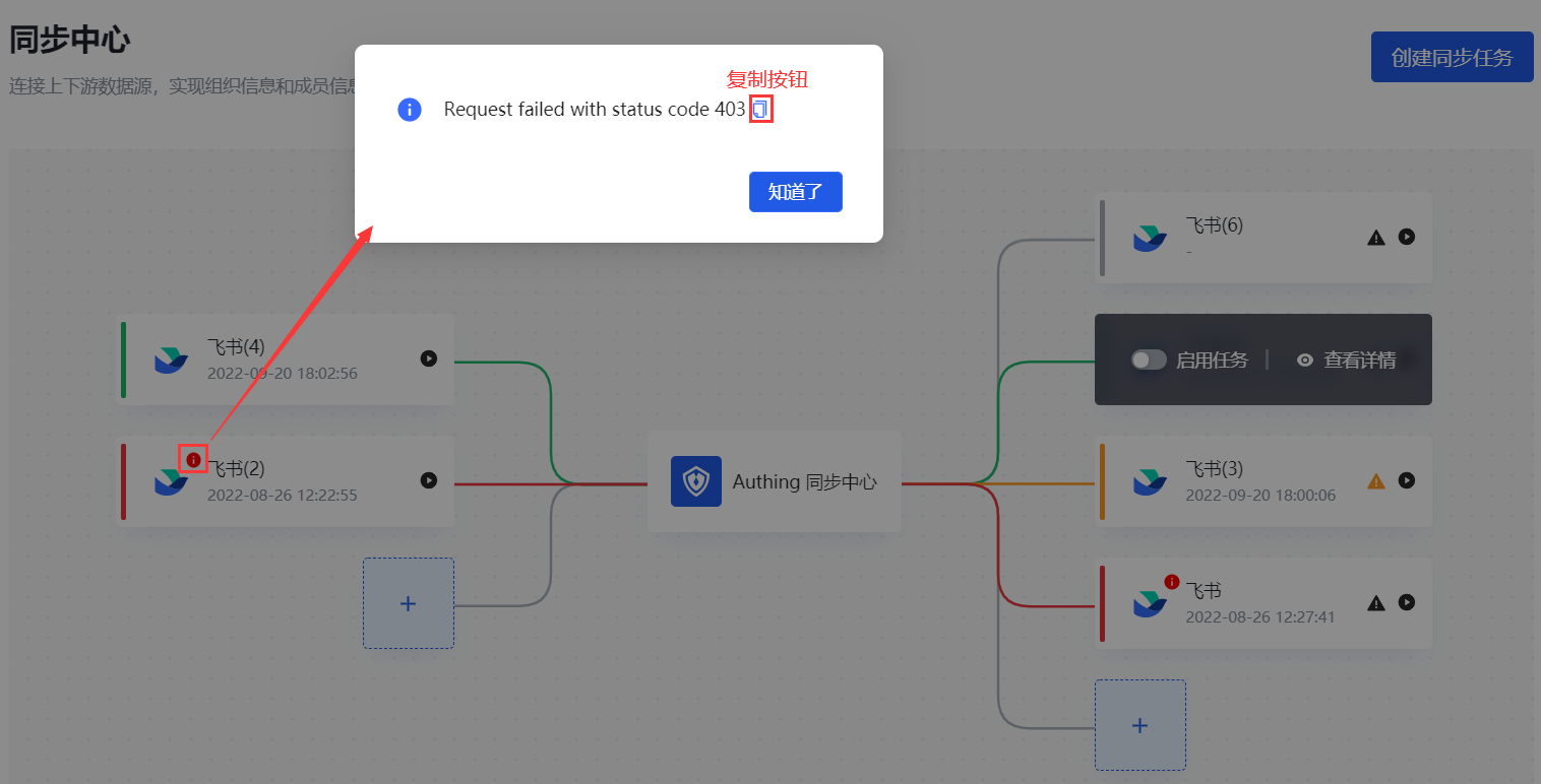 - 对于执行失败的同步任务,Authing 同步中心除了赋予红色标识,在相应任务卡片上还给出红色报错提示,点击即可打开报错弹窗。管理员可以点击按钮拷贝报错信息,便于查询。