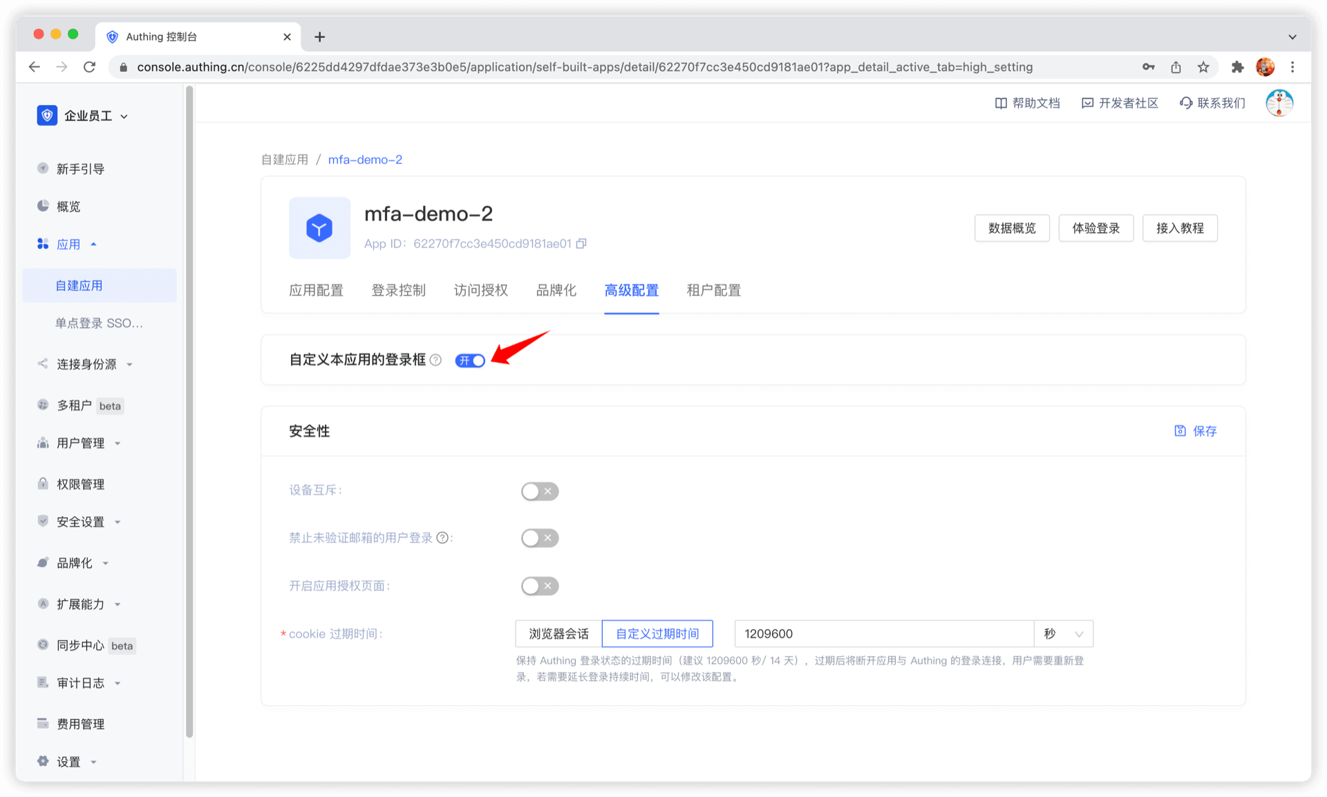 在 应用详情 - 高级配置 页,开启 自定义本应用的登录框