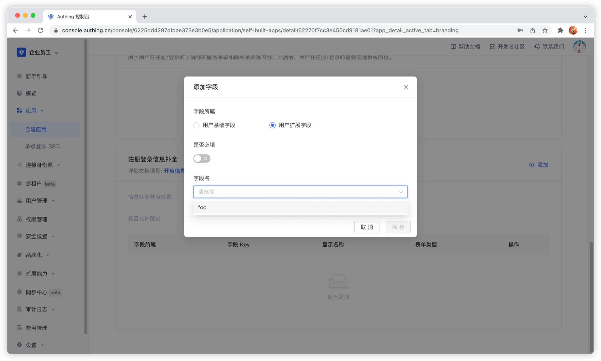 配置自定义字段之后,你可以开启应用的注册信息补全页面,让用户补全这些自定义字段的信息。