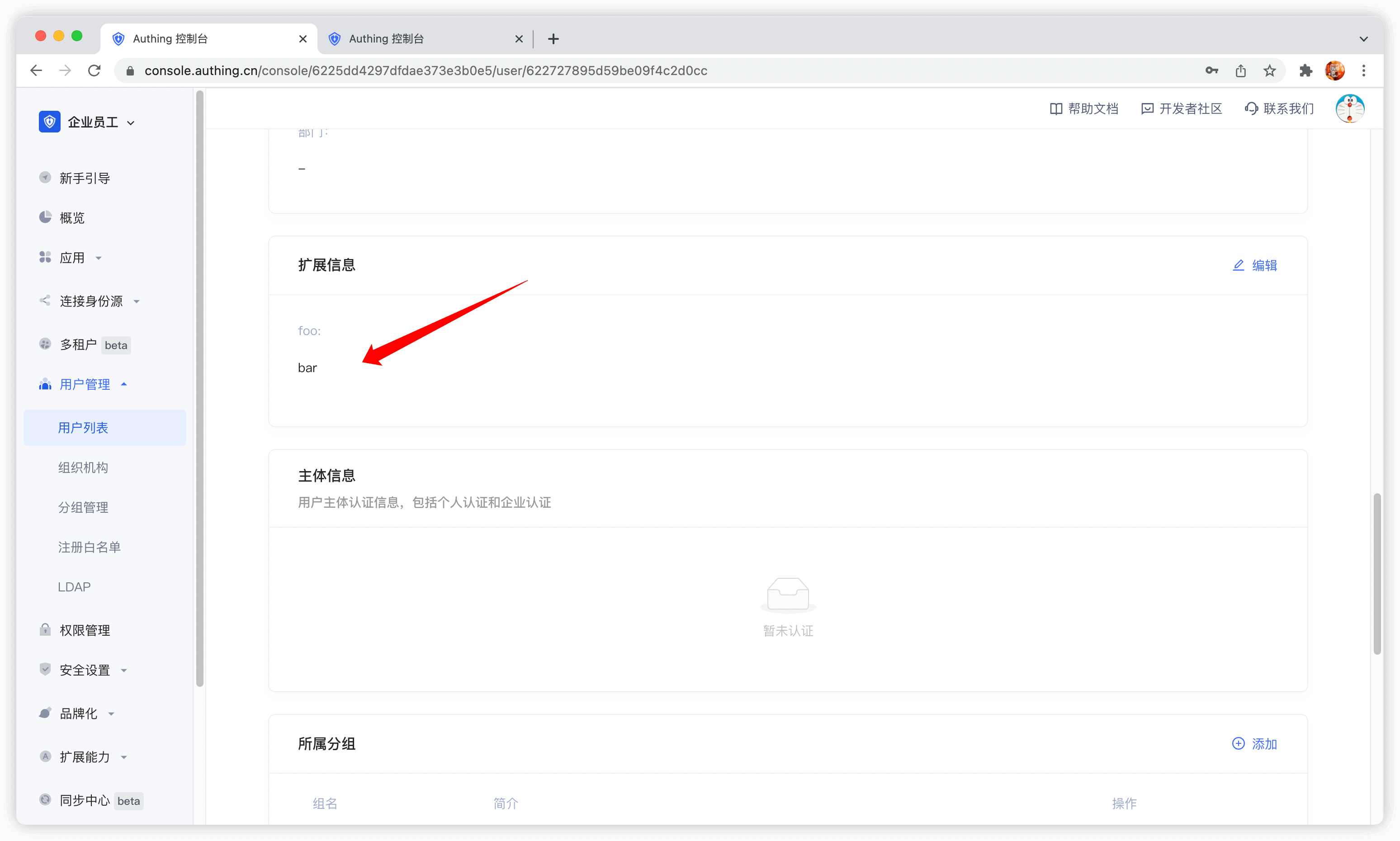 用户成功注册之后,你可以在用户详情页面看到用户刚刚输入的自定义字段值: