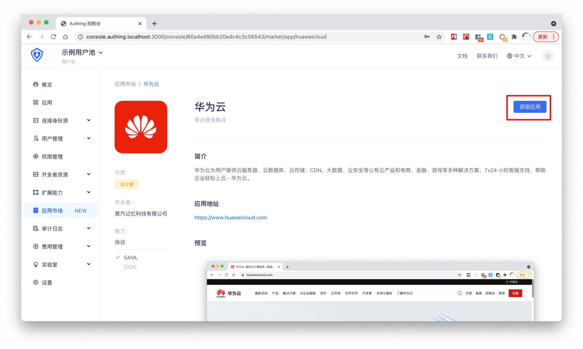 进入控制台 (opens new window) > 单点登录 SSO > 添加应用 ,找到华为云,点击进入详情,然后点击获取应用。