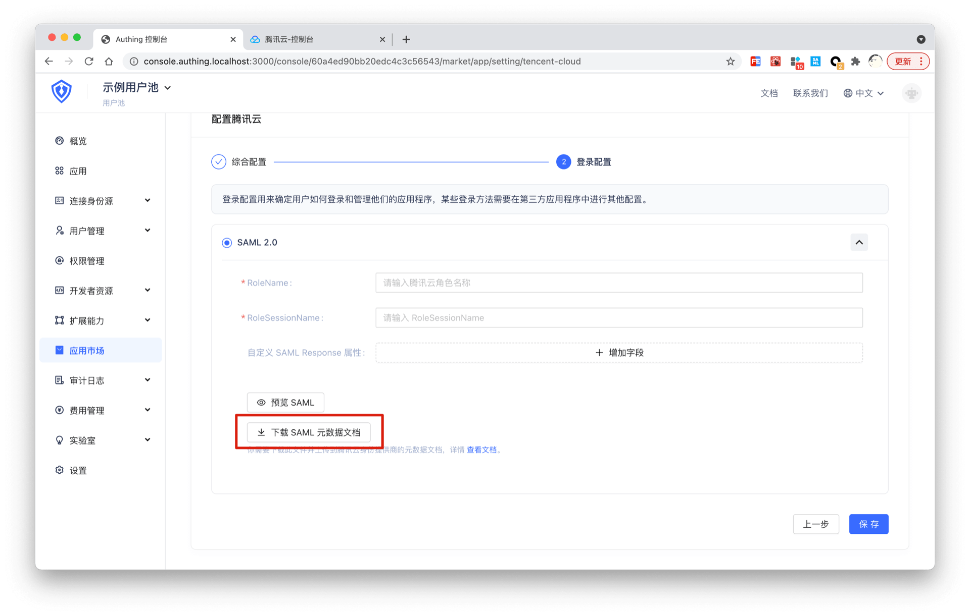 填写好上述内容后,点击下一步,应用即创建完成,然后点击下载 SAML 元数据文档。