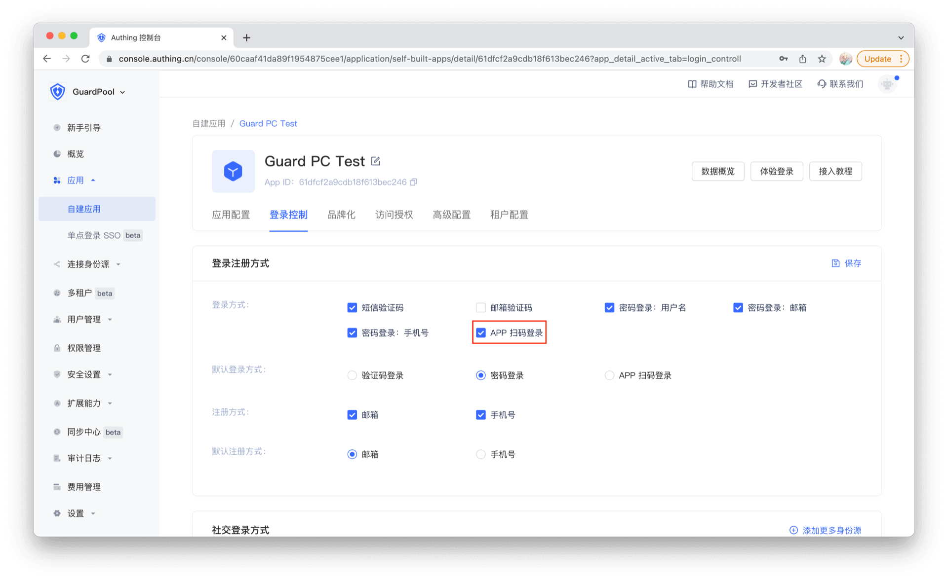 要使用自建 App 扫码登录能力,请在 Authing 控制台勾选 "App 扫码登录" 选项。